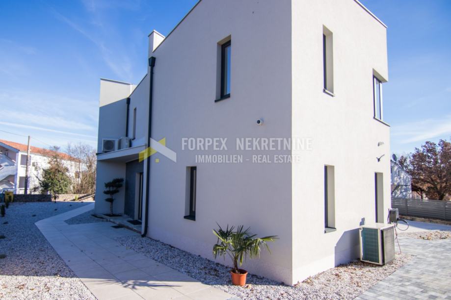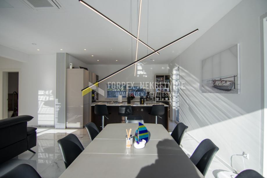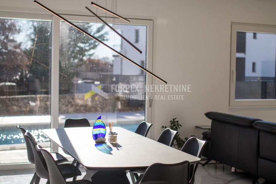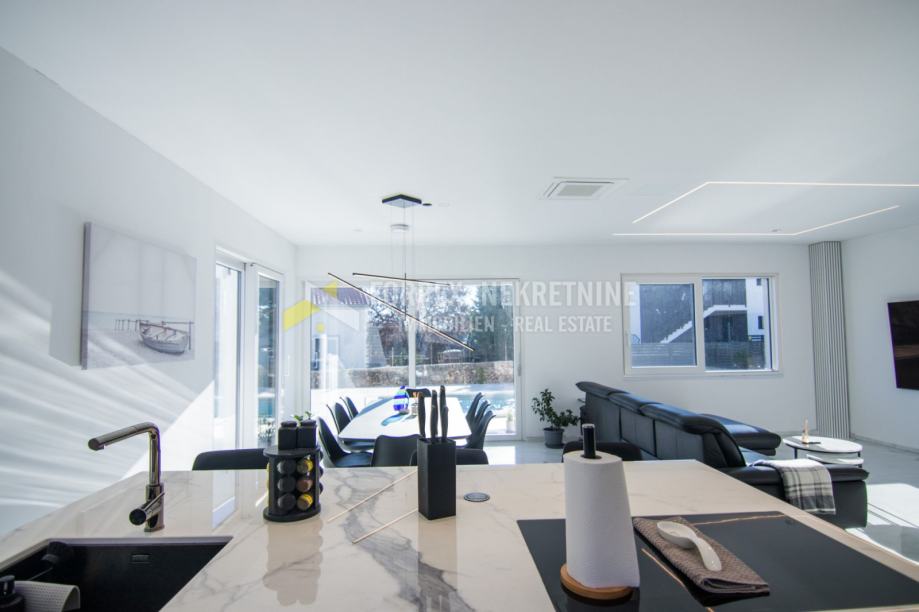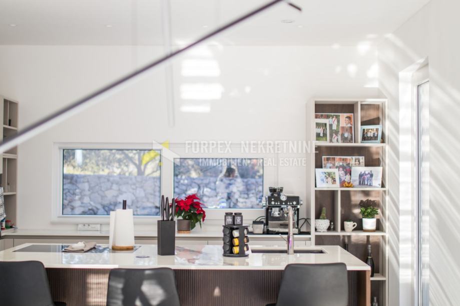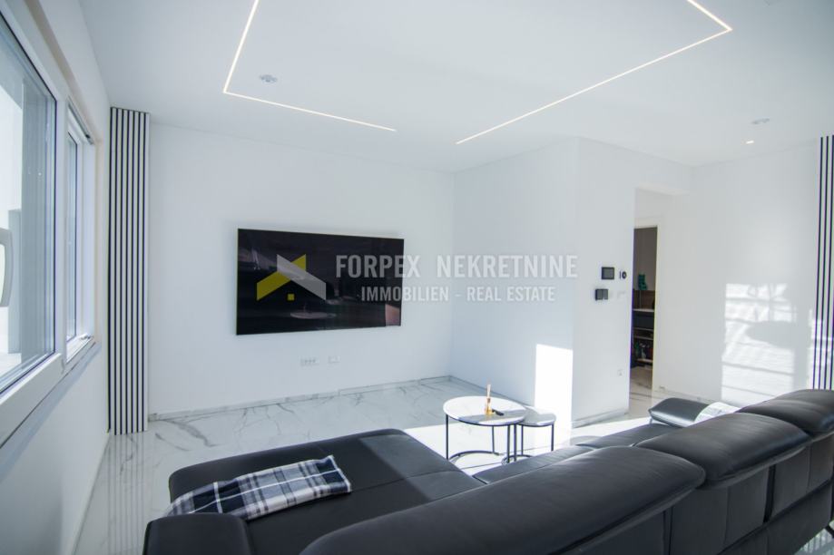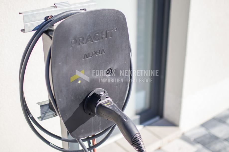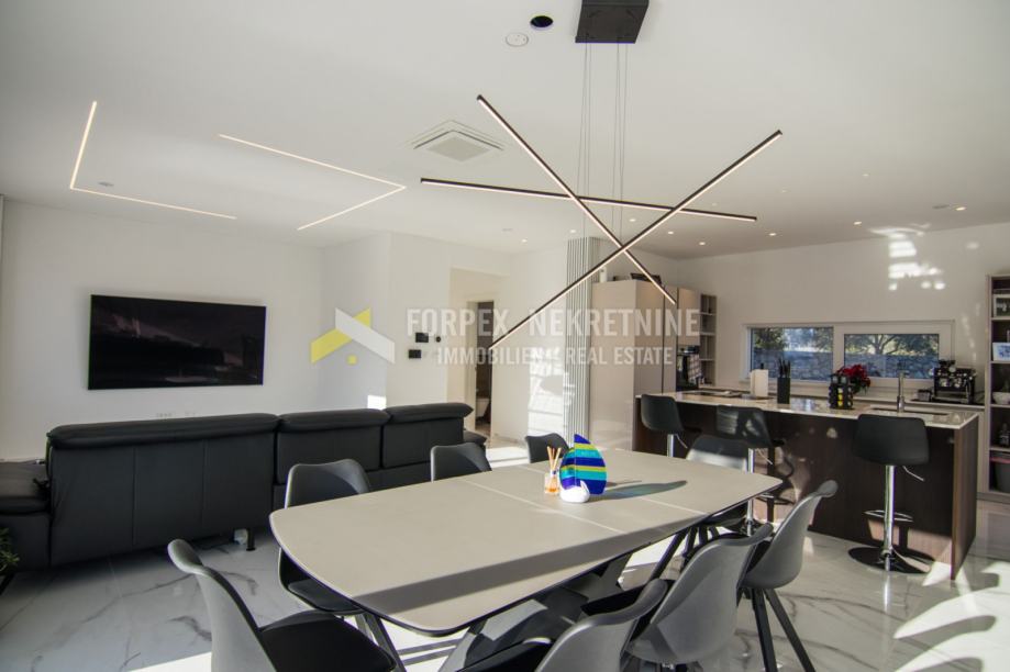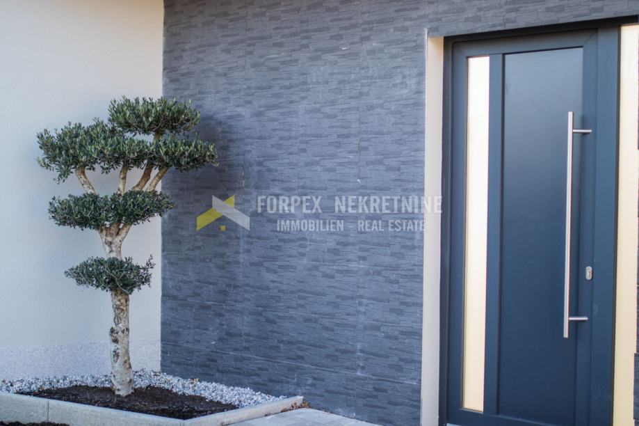 U sklopu okućnice je prostor za parkiranje nekoliko automobila, vanjska kuhinja natkrivena bioklimatskom pergolom, te prostor za saunu i teretanu.