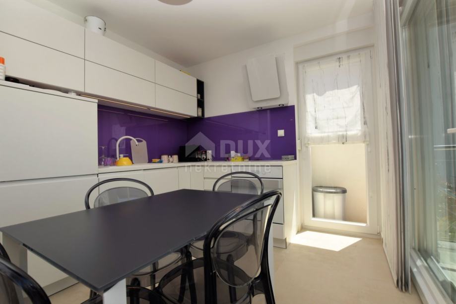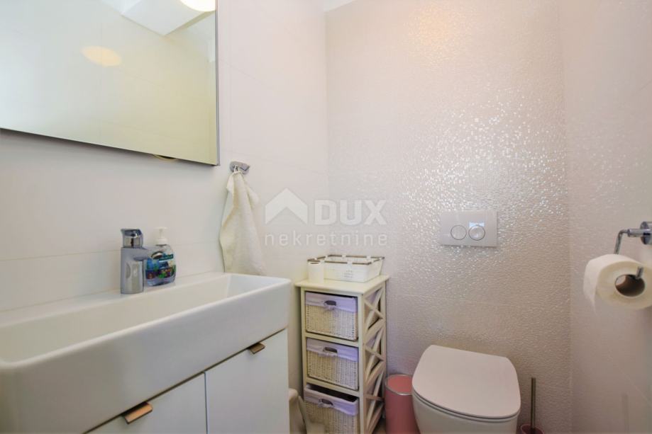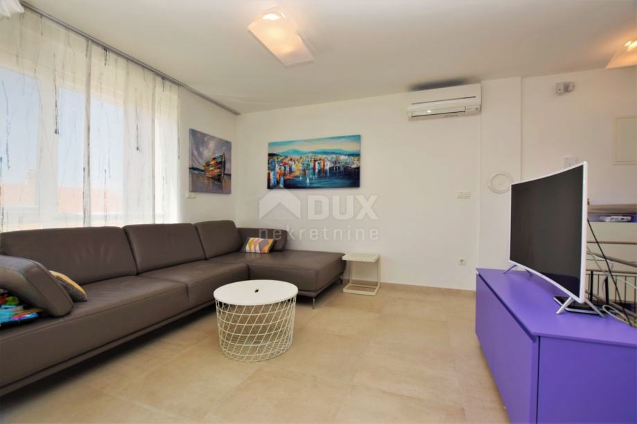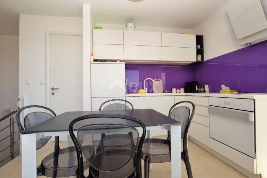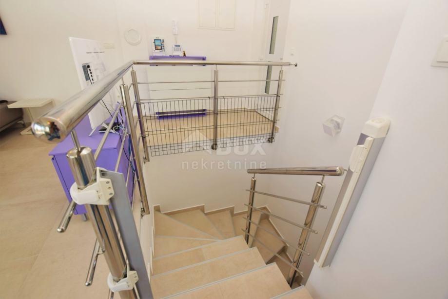 Stambena površina od 71 m2 obuhvaća ulazni hodnik, toalet, dnevni boravak, kuhinju i blagovaonicu i natkrivenu terasu na katu, dok se unutarnjim stubištem spuštamo u suteren zgrade gdje se nalazi dječja soba, master soba sa kupaonicom, kupaonica, hodnik i manje spremište. Posebnost suterena je izlaz na okućnicu sa grijanim bazenom, ljetnom kuhinjom te mjestom za uživanje. Terasa se natkriva tendom na električno upravljanje, što prostor čini ugodnim za korištenje. S terase se pruža prekrasan pogled na more.