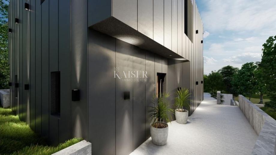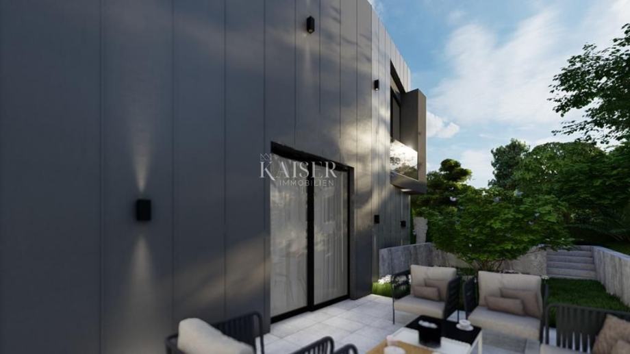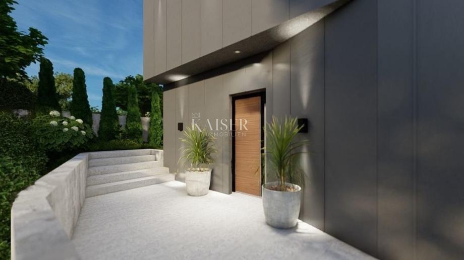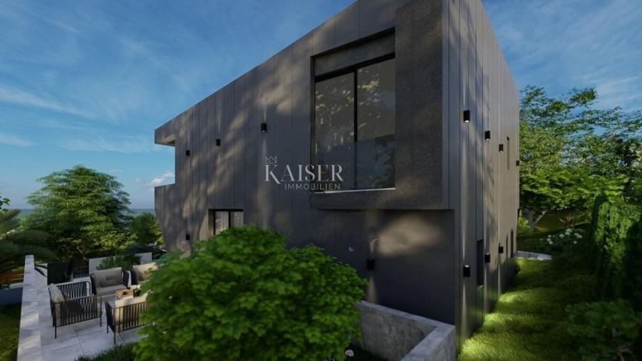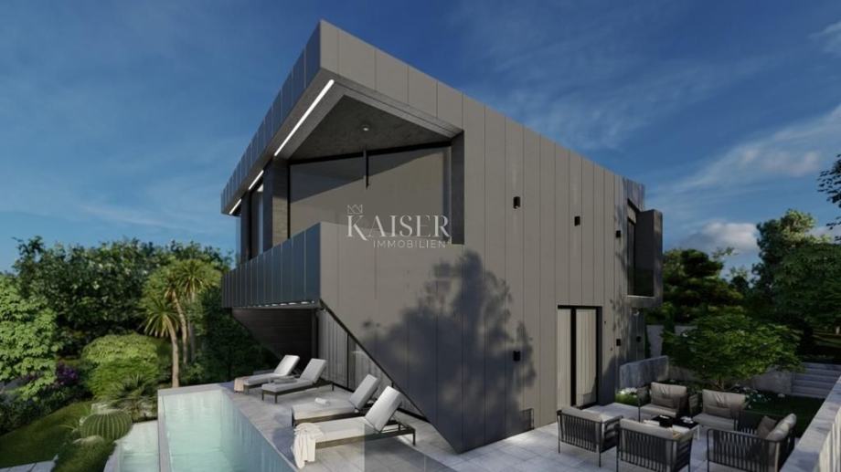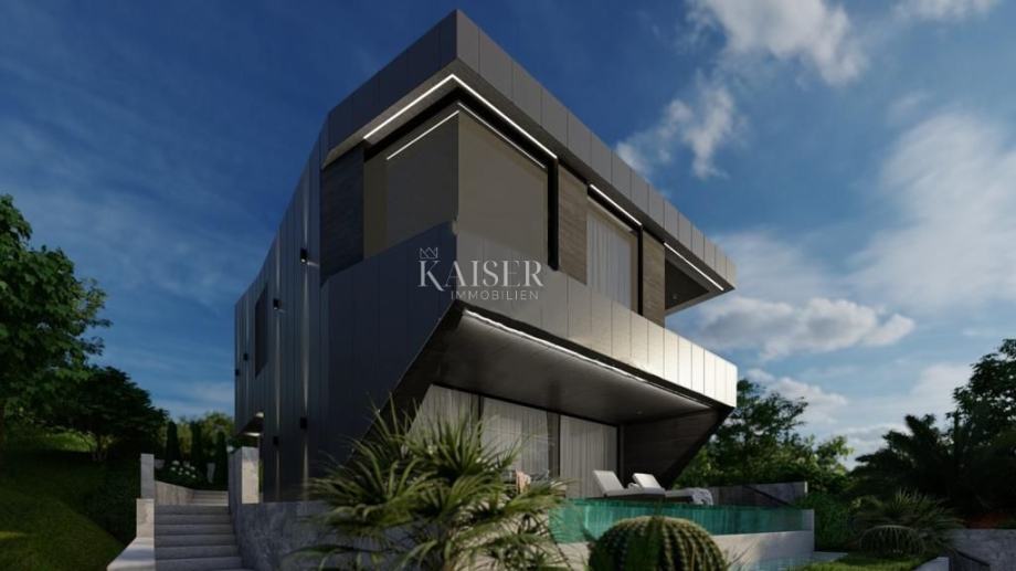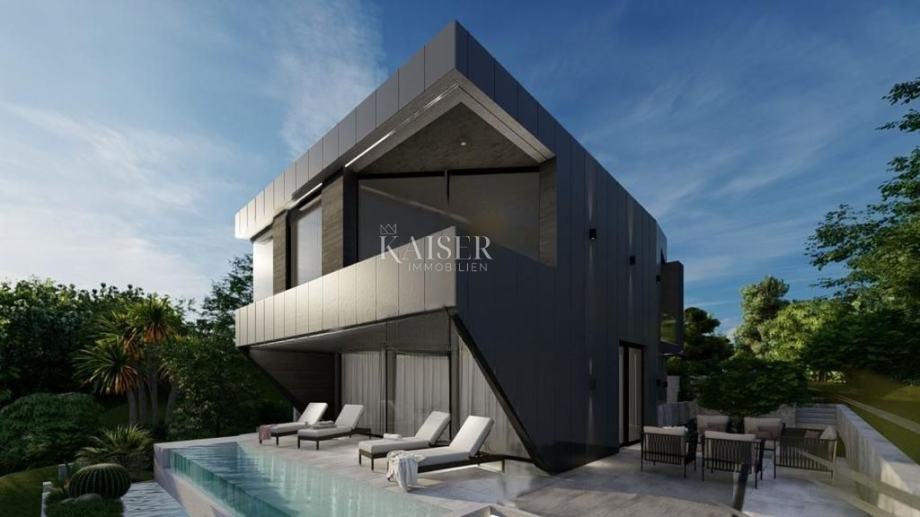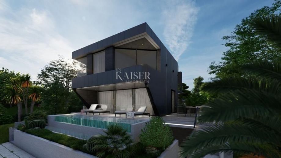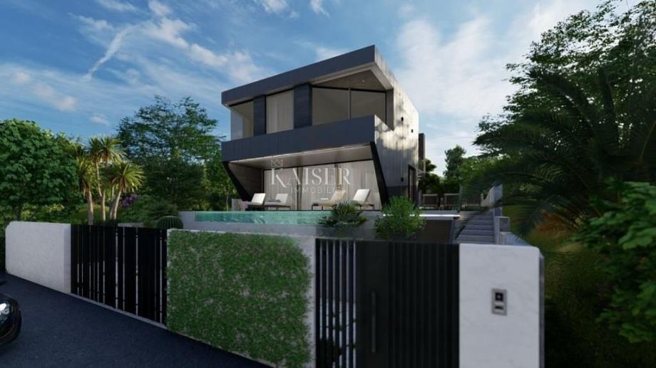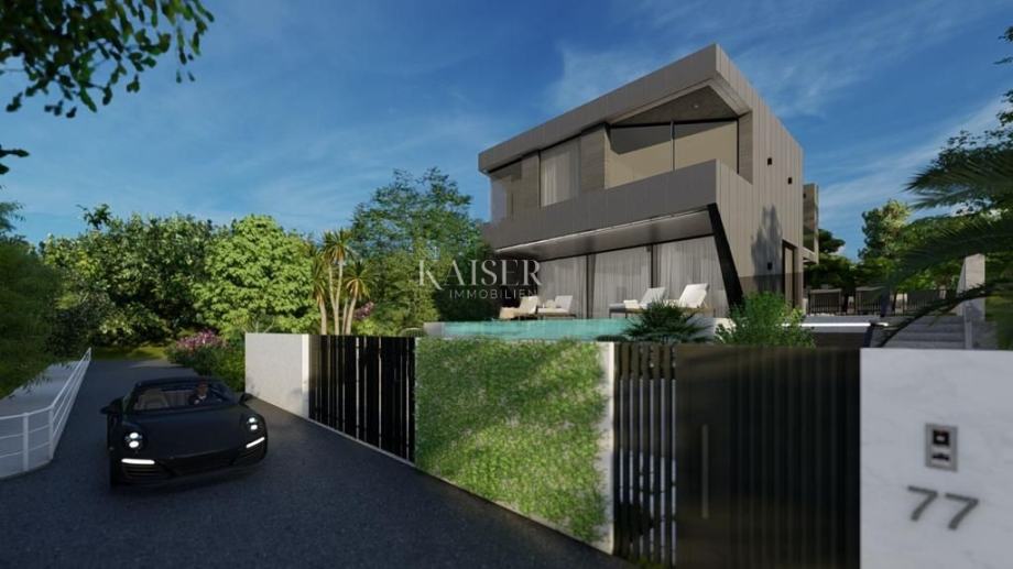 VIlla ukupne stambene površine 349m2 razvedena je na tri etaže. U prizemlju se nalazi otvoreni koncept boravka, kuhinje i blagovaonice sa direktnim izlazom u prekrasan vrt sa infinity bazenom, sunčalištem i panoramskim pogledom na more. Na katu povezanom unutarnjim stubištem se nalazi spavaći dio sa četiri sobe, svaka sa vlastitom prostranom kupaonicom i walk in garderobom. Panoramski pogled na more iz spavaćih soba ovdje je doveden na još višu razinu. Dodatna posebnost ove nekretnine je suteren u kojem je smještena wellness zona sa saunom, jacuzzijem i sobom za igre.