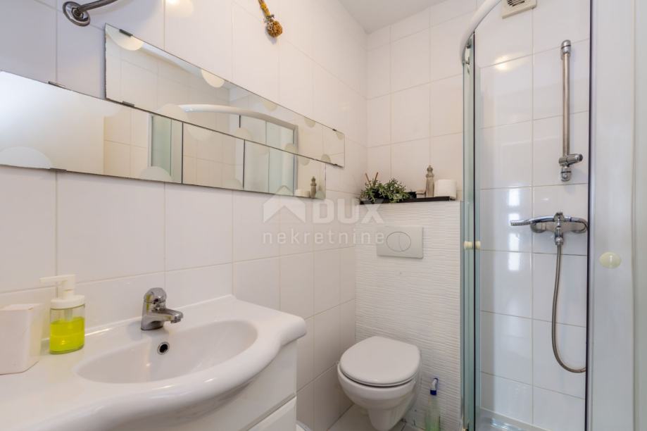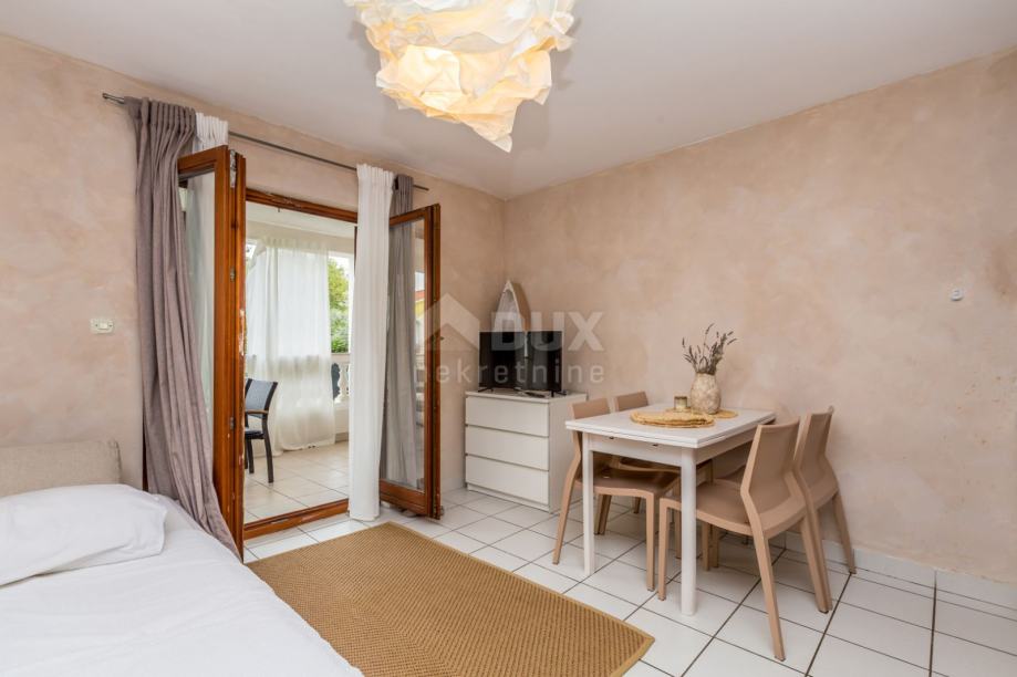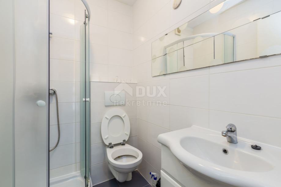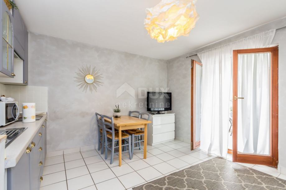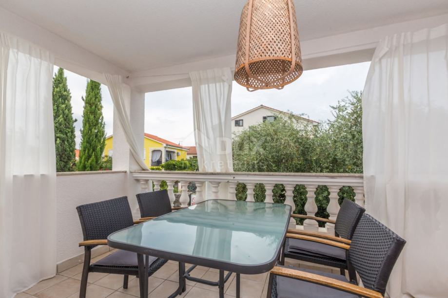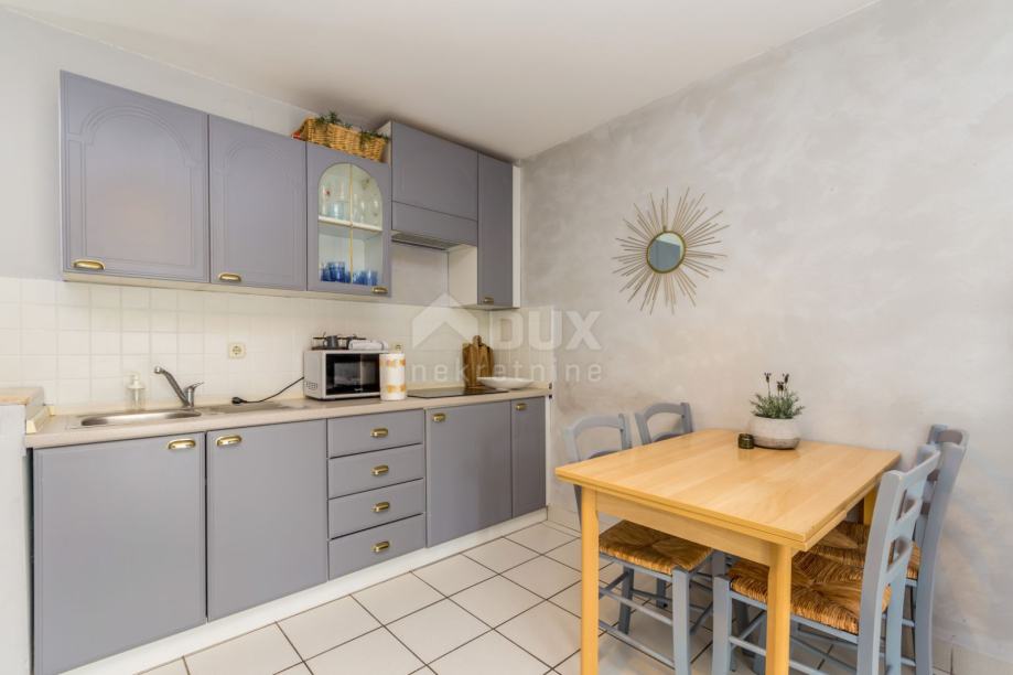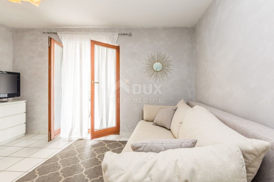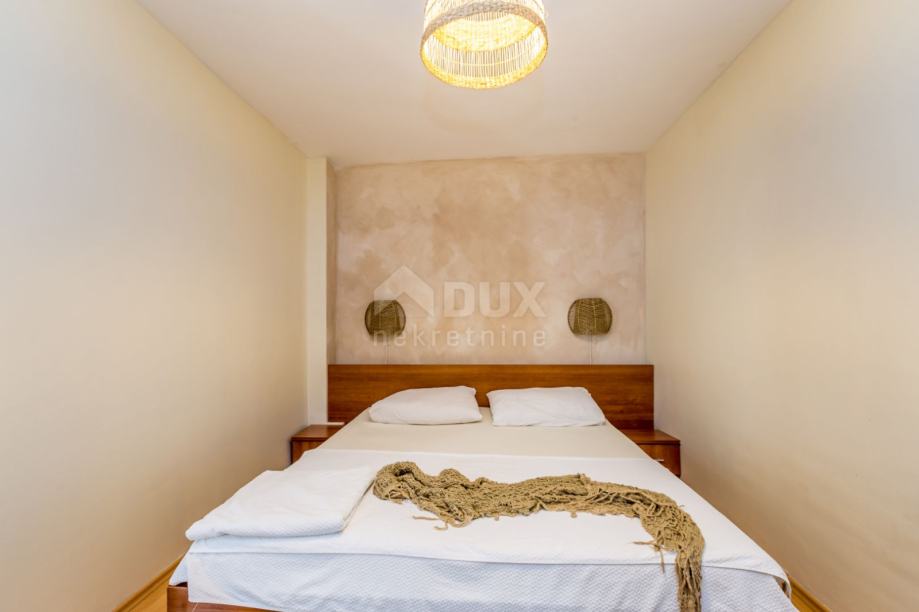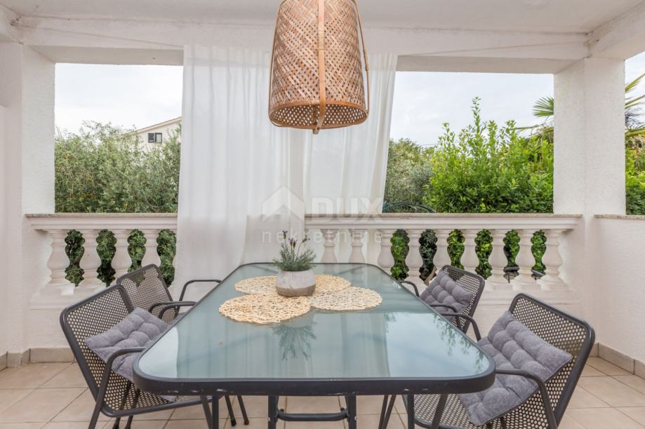 Na oko 450 metara od mora smjestio se ovaj lijepi apartman. Nalazi se u kući s više apartmana na visokom prizemlju. Podijeljen je na dva jednaka apartmana koji se sastoje od kupaonice, spavaće sobe, kuhinje, blagovaonice i dnevnog boravka iz kojih se izlazi na terasu. Objekt se prodaje potpuno namješten, a pripada mu jedno parkirno mjesto. Ovo je dobra opcija za iznajmljivanje, ali i za vlastito uživanje u dobroj poziciji i moru.