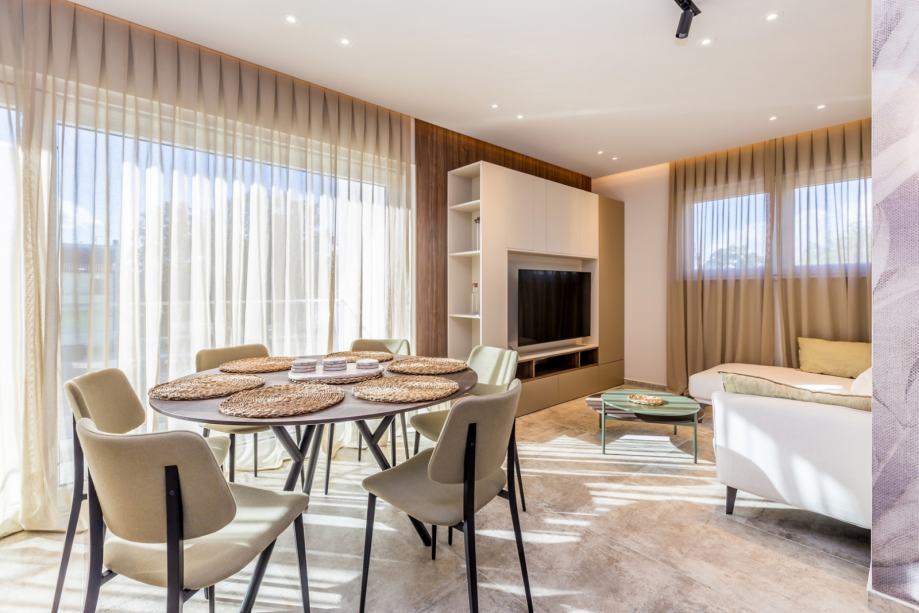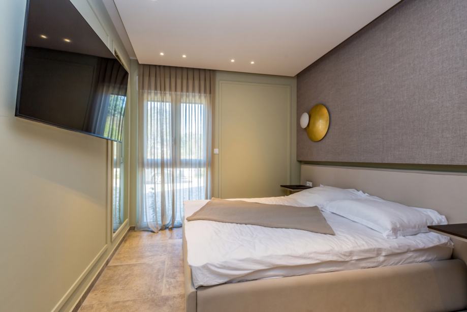 Apartman ima vlastiti ulaz. U prizemlju se nalazi hodnik, ostava, jedna spavaća soba i kupaonica. Unutrašnje stepenice vode na kat, gdje se nalazi dnevni boravak s kuhinjom i blagovaonom, dvije spavaće sobe i kupaonica, te balkon. Na krovnoj terasi nalazi se bazen i sunčalište, te tuš i ljetna kuhinja. Kod gradnje su korišteni najkvalitetniji materijali, energetski certifikat A klasa, podno grijanje na struju u svim prostorijama, klimatizirane sve prostorije. Apartman je potpuno namješten dizajnerskim namještajem i opremljen.