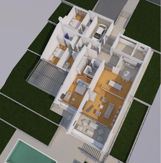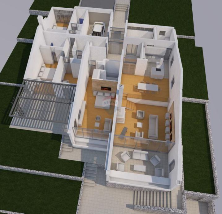 Unutrašnjost kuće osmišljena je funkcionalno i elegantno. Sastoji se od glavne spavaće sobe s vlastitom kupaonicom i izlazom na terasu, dvije dodatne spavaće sobe, još jedne kupaonice, zasebnog toaleta, vešeraja, kuhinje i dnevnog boravka koji vodi na terasu s pogledom na more. Tu su još i kotlovnica, spremište te garaža, što osigurava dodatni komfor i praktičnost.