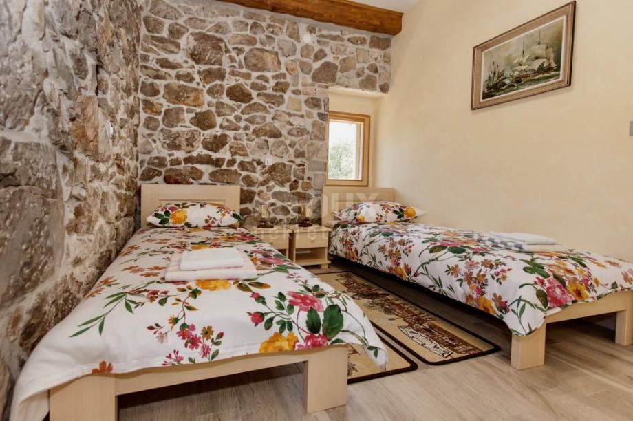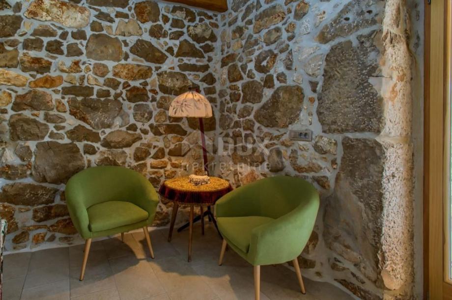 Vila je opremljena prekrasnim namještajem i tradicionalnim kamenim detaljima koji joj daju starinski šarm, a gredama na stropu dodatno se naglašava autentičnost i karakter ovog prostora.
