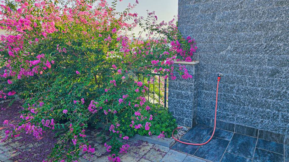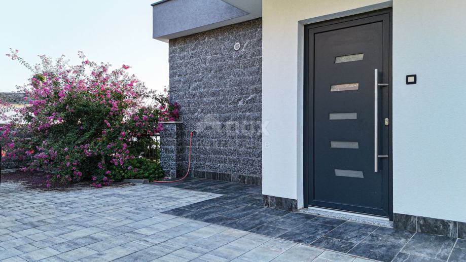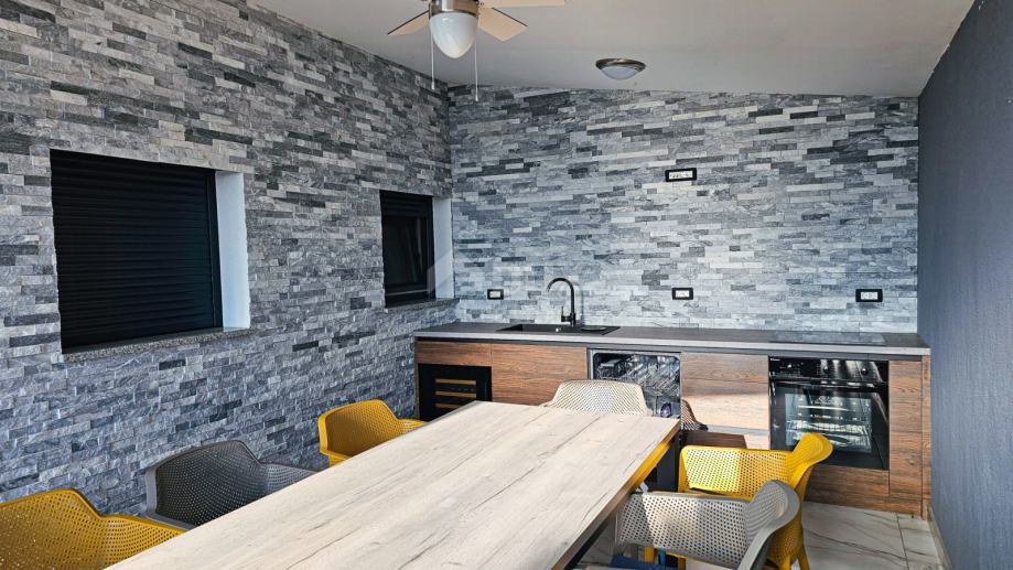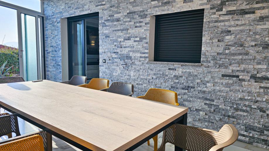 Sastoji se od dva apartmana koji mogu funkcionirati posebno i kao cjelina. Jedan apartman sastoji se od dnevnog boravka s kuhinjom i blagovaonom, dvije spavaće sobe i dvije kupaonice. Drugi apartman je dvoetažni, ima tri spavaće sobe, tri kupaonice, dnevni boravak s kuhinjom i blagovaonom. U prizemlju se nalazi jedna natkrivena i zatvorena terasa, na katu je velika natkrivena terasa s panoramskim pogledom na more. Na okućnici nalazi se priprema za jacuzzi. Kuća će biti potpuno opremljena i namještena uključujući i posebne vinske hladnjake. Vrhunska oprema i kvalitetni materijalni, kvalitetna PVC stolarija, podno grijanje , toplinska pumpa i tri solarna kolektora. Kuća također ima četiri klima uređaja.