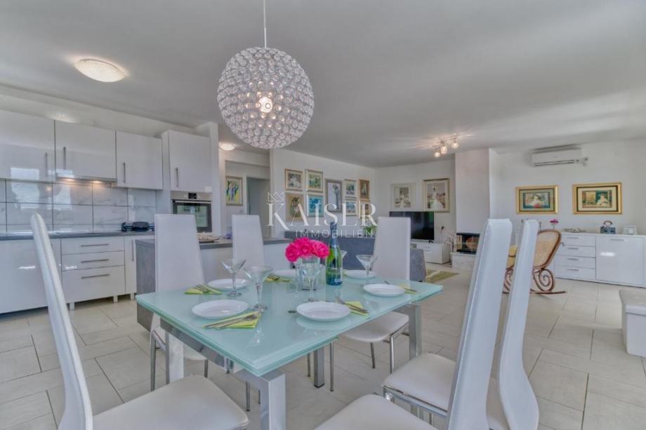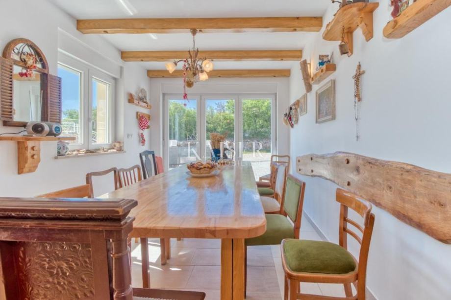 Kat kuće ima vlastiti, odvojeni ulaz čime se dodatno osigurava privatnost. Ulaz vodi do prostranog i svijetlog dnevnog prostora otvorenog koncepta s potpuno opremljenom kuhinjom (perilica suđa, pećnica, električni štednjak, aparat za kavu i drugo), blagovaonicom te dnevnim boravkom s funkcionalnim kaminom koji pruža poseban ugođaj tijekom zimskih mjeseci. Iz dnevnog boravka izlazi se na veliku natkrivenu terasu s neometanim pogledom na more. Na katu se nalaze još dvije udobne spavaće sobe i dvije moderno uređene kupaonice.