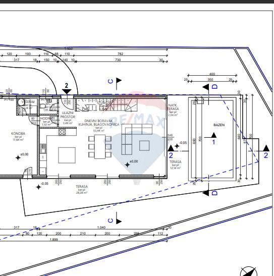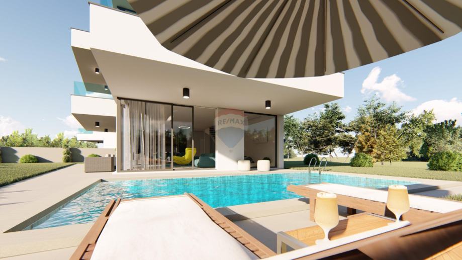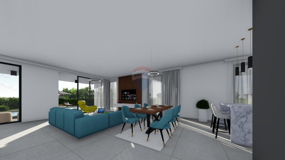 terase se nalazi bazen. U prostoru dnevnog boravka, kuhinje i blagovaonice se nalazi stubište koje vodi