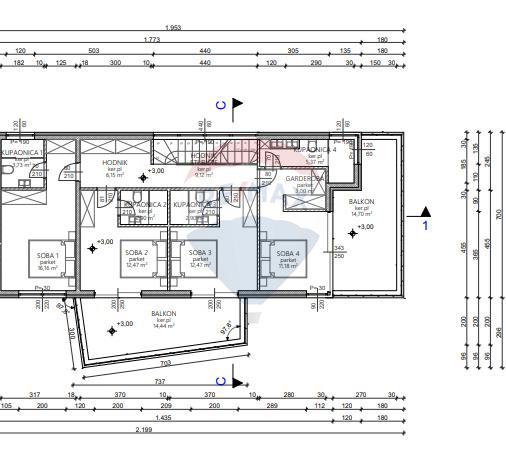 Druga i treća soba se nalaze po sredini. obje sobe imaju vlastite kupaonice, te staklene