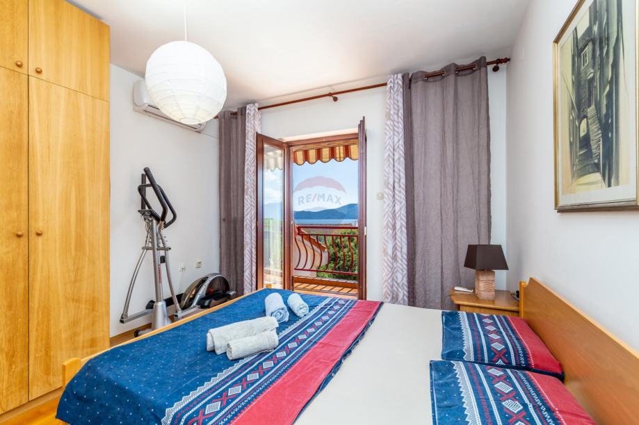 Na prvom katu kuće nalazi se apartman s dvije spavaće sobe, kupaonicom, prostranim dnevnim boravkom povezanim s kuhinjom i blagovaonicom te terasom s prekrasnim pogledom na more. Na drugom katu su još četiri spavaće sobe, hodnik, kupaonica te terasa s panoramskim pogledom.