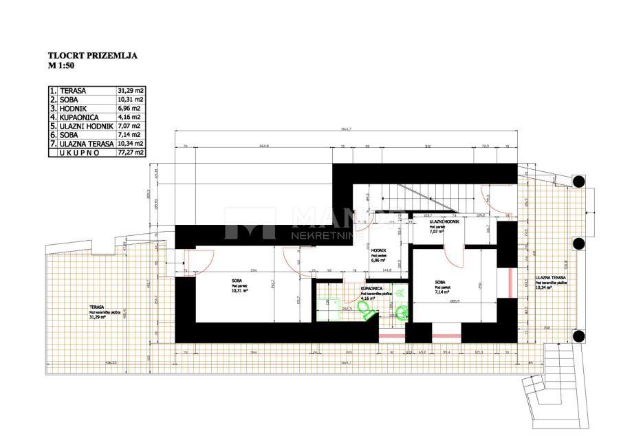 U prizemlju nalazimo ulazni prostor, hodnik, dvije spavaće sobe, kupaonicu, trijem i veliku terasu.