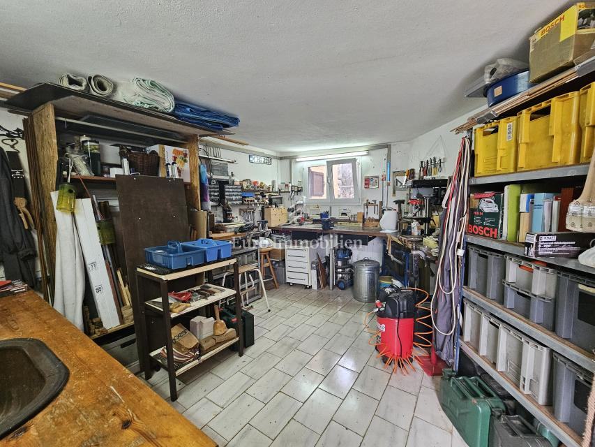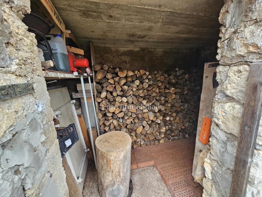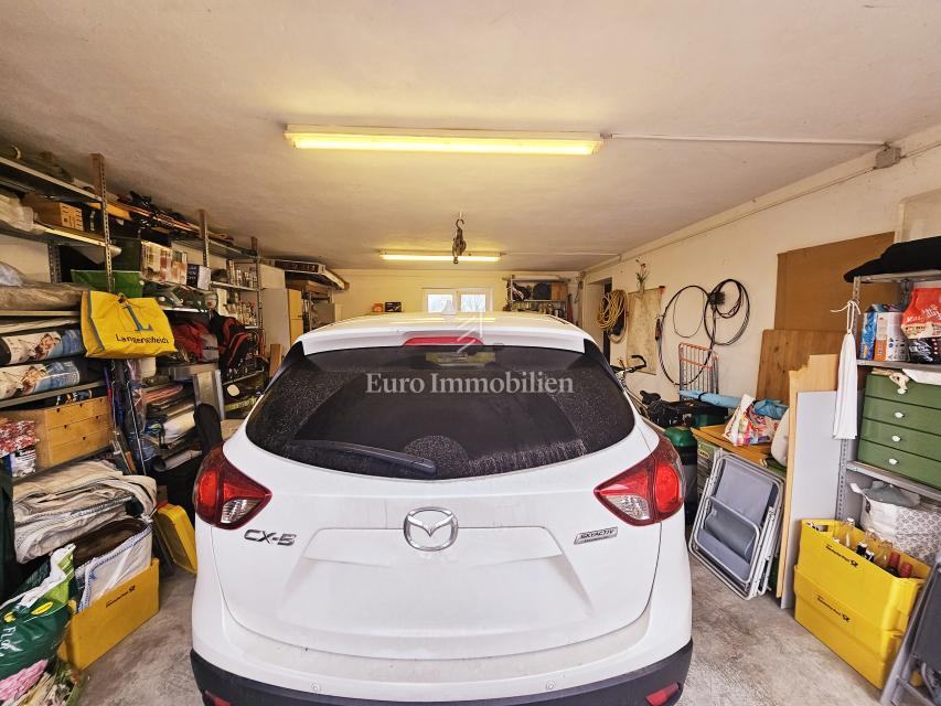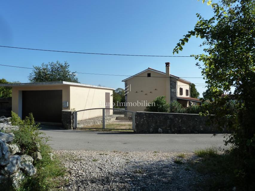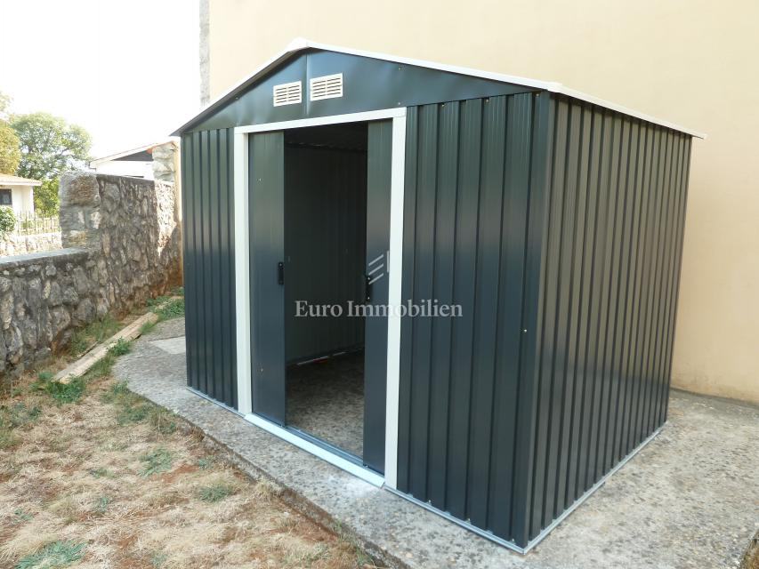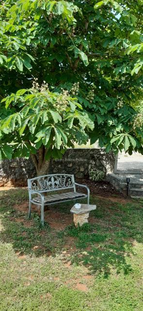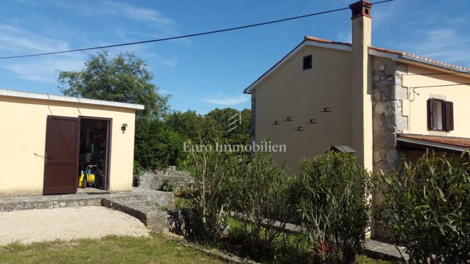 Na lijepo uređenoj okućnici omeđenoj kamenim zidom nalazi se prostrana garaža površine cca 35 m2 za dva vozila, cisterna cca 36 m2, radionica cca 12 m2.