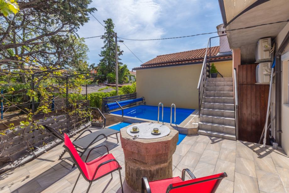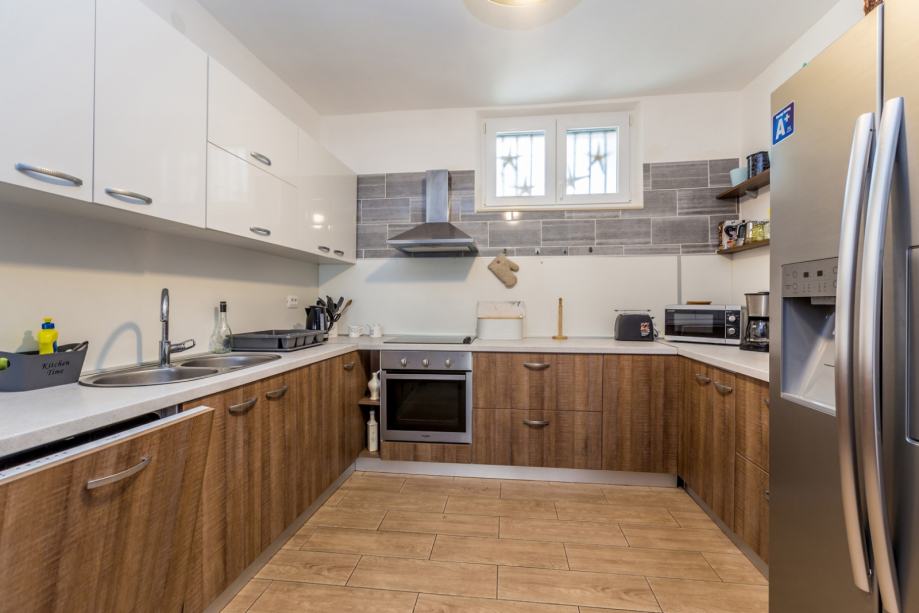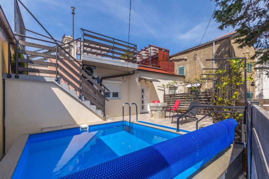 Kuća se prostire kroz tri etaže – prizemlje, kat i prostranu krovnu terasu. U prizemlju se nalazi udoban dnevni boravak s kuhinjom i blagovaonicom, dodatni WC, spremište, konoba te posebno uređena prostorija za zabavu. Na katu su smještene četiri elegantne spavaće sobe, svaka s vlastitom kupaonicom, garderoba, dodatni WC te terasa s grijanim bazenom. Vanjsko stepenište vodi na spektakularnu krovnu terasu površine 22 m², gdje vas očekuje jacuzzi i nezaboravan panoramski pogled, posebno prema otoku Cresu.