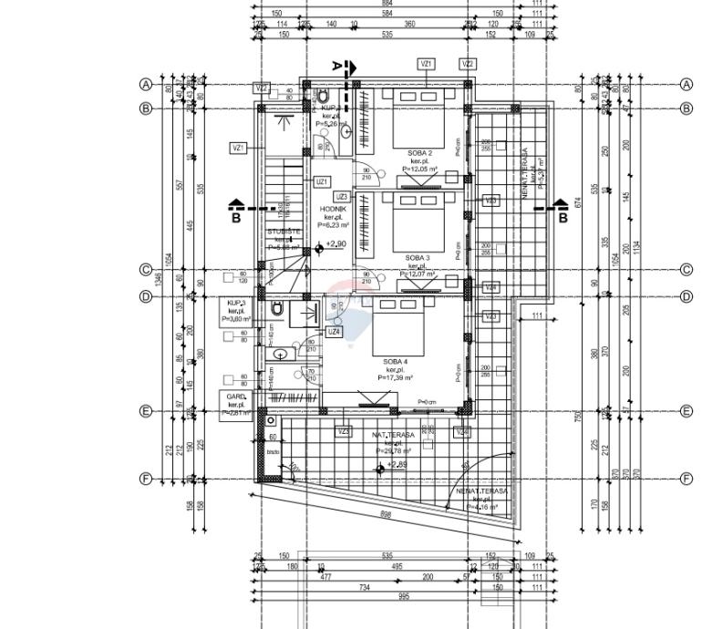 Prizemlje obuhvaća natkriveni ulaz, ulazni prostor, jednu spavaću sobu, kupaonicu, saunu, dnevni boravak s kuhinjom i blagovaonicom, dvije ostave, toalet, unutarnje stepenište za kat te natkrivenu terasu s izlazom na okućnicu. Na katu se nalaze stubište, hodnik, tri spavaće sobe, od kojih jedna ima vlastitu kupaonicu i garderobu, dodatna kupaonica te prostrana natkrivena terasa s djelomičnim pogledom na more.