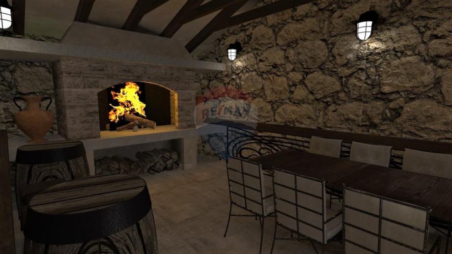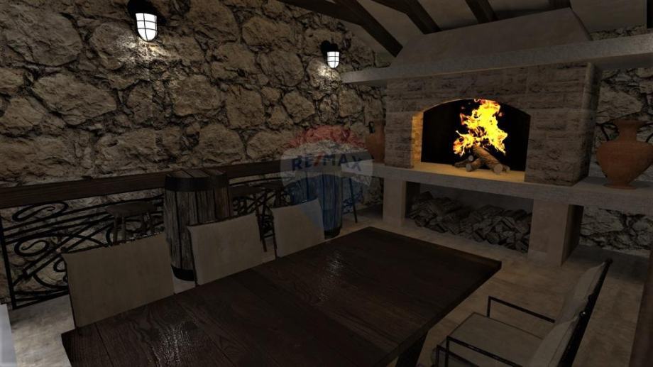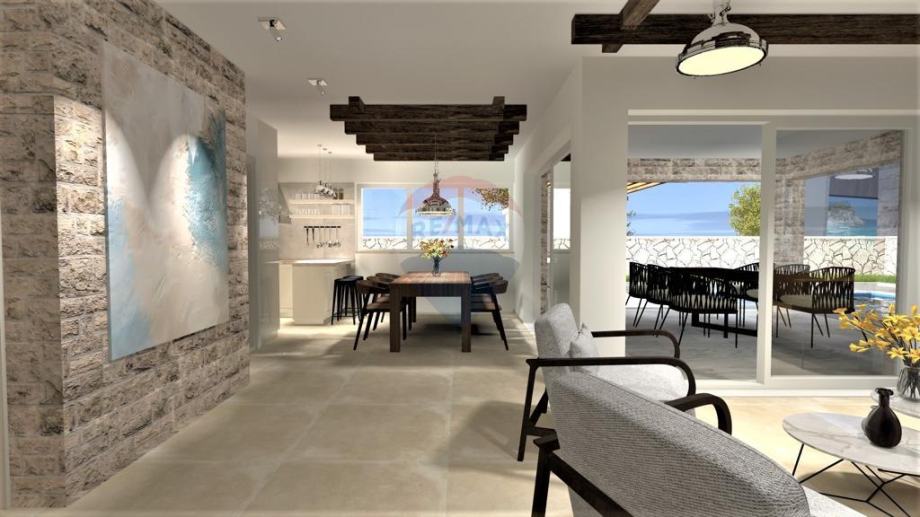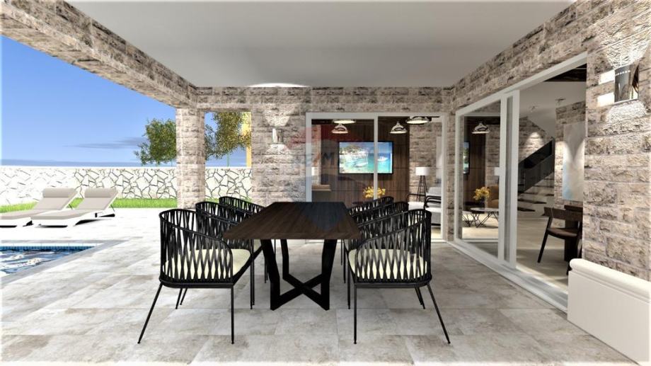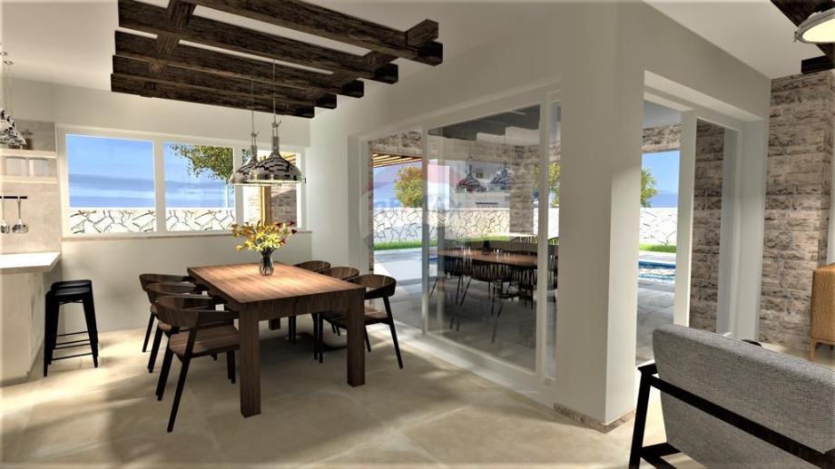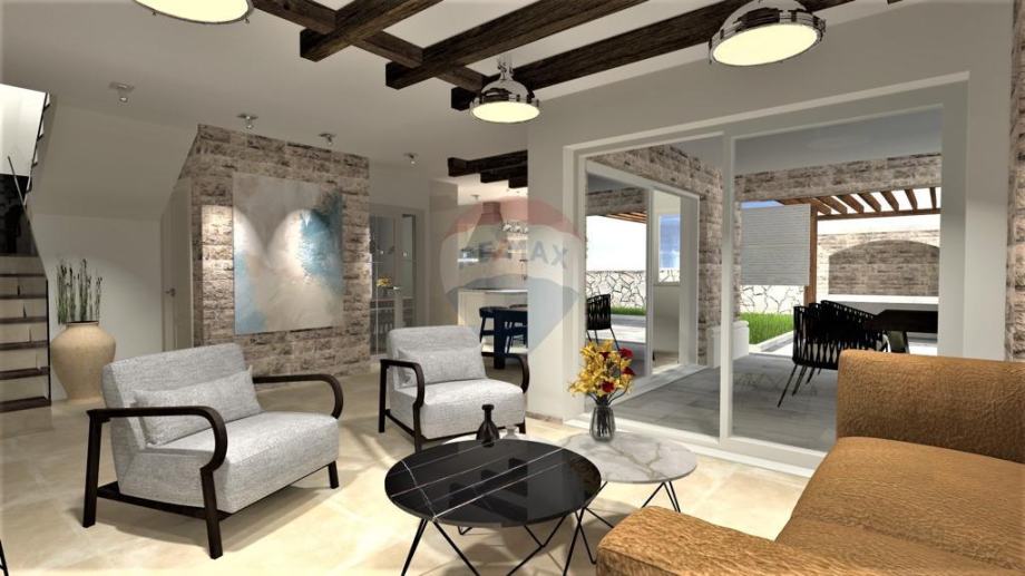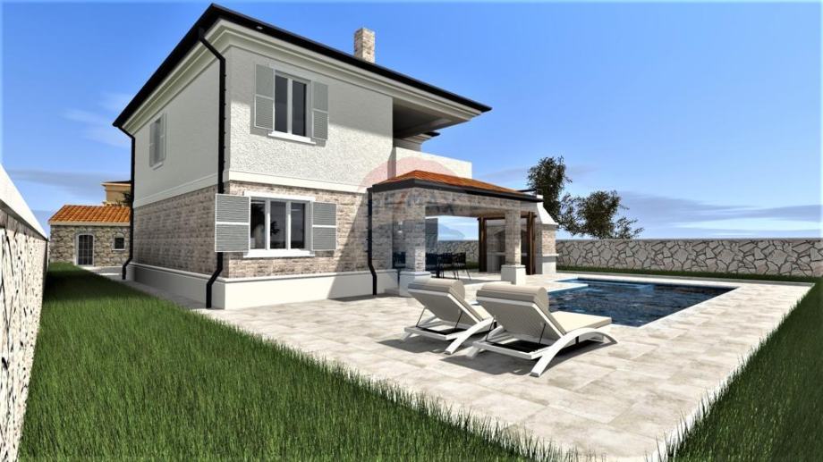 Moderna mediteranska vila, ukupne stambene površine 136 m2, nalazi se u mirnom dijelu okolice Vrbnika. Sastoji se od prizemlja i prvog kata. U prizemlju se nalaze kuhinja s blagavaonicom, dnevni boravak, toalet i utility, te velika natkrivena terasa. Na prvom katu smještene su soba sa vlastitom kupaonicom, te jos dvije sobe koje dijele jednu kupaonicu, te natkrivena prostrana terasa. Na lijepo uređenoj okućnici nalazi se bazen sa sunčalištem, konoba kao odvojena građevina, te parking za više vozila. Kvalitetna gradnja i oprema, klimatizirano, vrhunska keramika, pvc stolarija. Prodaje se nenamješteno. U mirnom dijelu okolice Vrbnika. Predviđeni završetak radova je 01.07.2023. Nekretnina idealna za život, kao i za turističko iznajmljivanje.