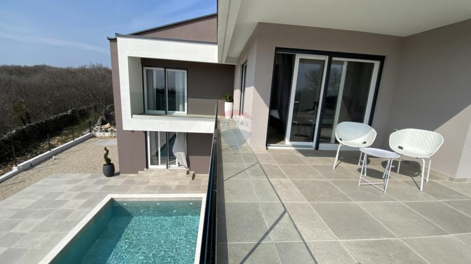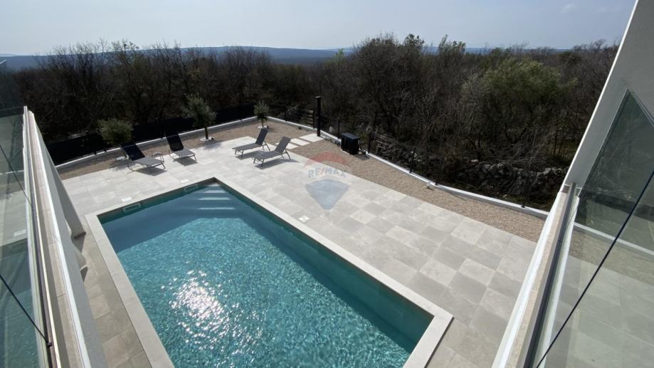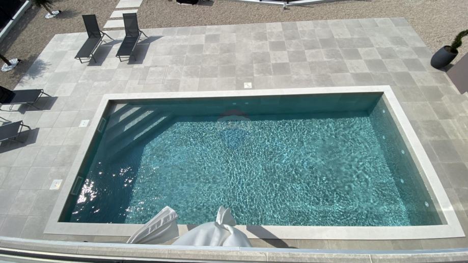 U uređenoj i ograđenoj okućnici nalazi se bazen od 30m2 sa slanom vodom grijan pomoću dizalice topline, sunčalište te do 5 parkirnih mjesta.