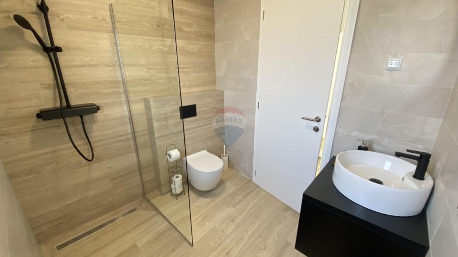 Proteže su na dvije etaže. U prizemlju je dnevni boravak, blagavaona, kuhinja otvorenog tipa s izlazom na terasu, jedna soba sa kupaonom, spremište te još jedan wc i vešeraj.