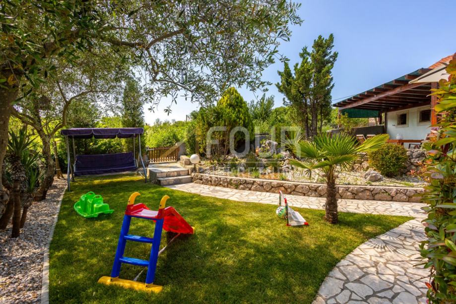 Okućnica nudi brojne sadržaje za opuštanje i uživanje, uključujući grijani bazen površine 29 m2, sunčalište, vanjski roštilj, vrt i vrtnu kućicu, kao i veliku terasu površine 16 m2. Prodaje se potpuno namještena i opremljena.