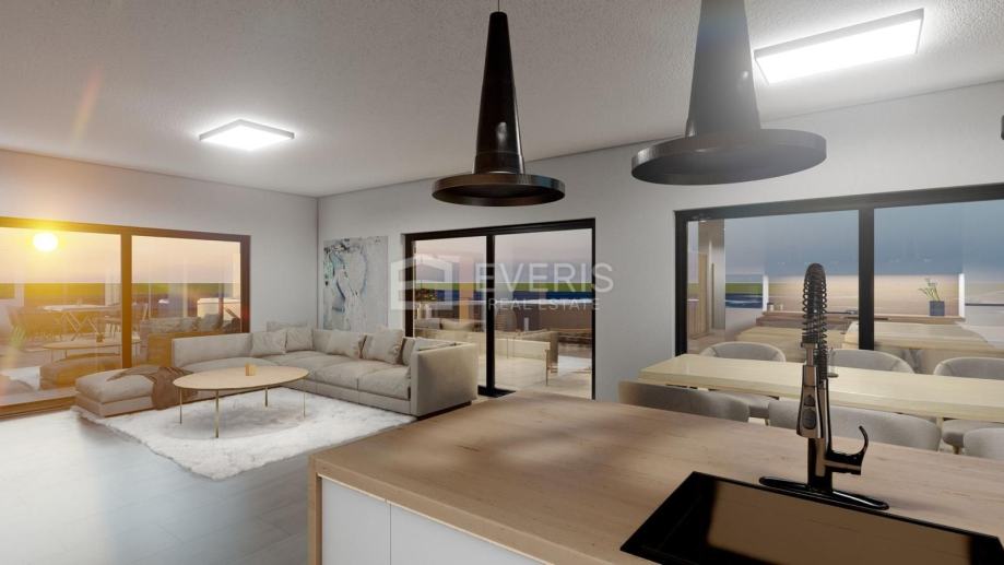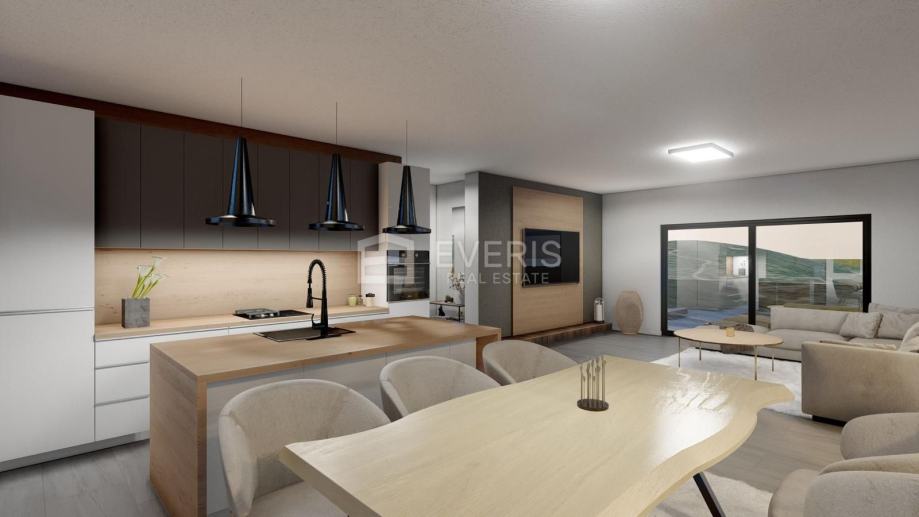 ▪ hodnik: 8,80 m2, kuhinja / blagovaona i dnevni boravak: 36,50 m2, vešeraj: 5,80 m2, spavaća soba 1: 16,90 m2, spavaća soba 2: 18 m2, kupaonica 1: 6,10 m2, kupaonica 2: 5 m2, garderoba: 2,80 m2; stanu pripada: terasa 2,40 m2, okućnica 200 m2, bazen, spremište u podrumu: 11,30 m2 te dva parkirna mjesta.