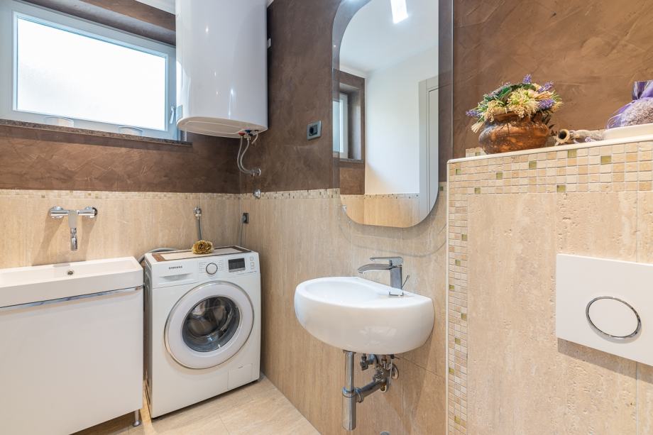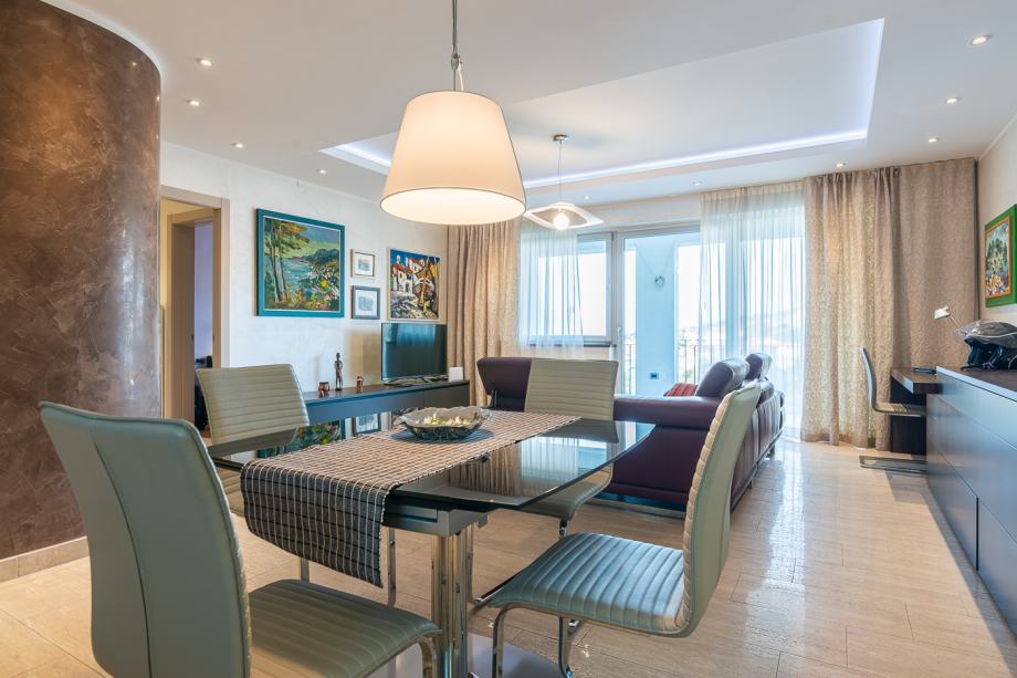 Na oko 700 metara od mora u prizemlju stambene zgrade smjestio se ovaj lijepi, moderan trosoban stan. Ima oko 106 m2,a sastoji se od kupaonice, WC-a, ostave, spavaće sobe, radne sobe, garderobe, kuhinje, blagovaonice, dnevnog boravka i lijepe, velike loggie s koje se pruža predivan pogled na more i grad Vrbnik. Stanu pripada drvarnica, okućnica od oko 40 m2 i jedno parkirno mjesto. Stan je renoviran i u njega su ugrađeni vrhunski materijali, postavljeno je podno grijanje, a hlađenje je riješeno klima uređajima. Stan se prodaje u potpunosti namješten.