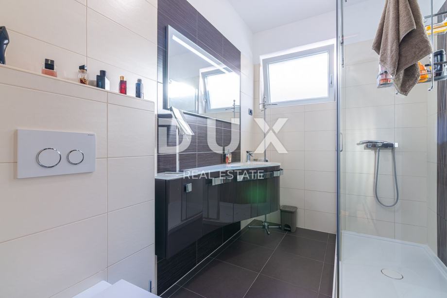 Na oko 700 metara od mora u prizemlju stambene zgrade smjestio se ovaj lijepi, moderan trosoban stan. Ima oko 106 m2,a sastoji se od kupaonice, WC-a, ostave, spavaće sobe, radne sobe, garderobe, kuhinje, blagovaonice, dnevnog boravka i lijepe, velike loggie s koje se pruža predivan pogled na more i grad Vrbnik. Stanu pripada drvarnica, okućnica od oko 40 m2 i jedno parkirno mjesto. Stan je renoviran i u njega su ugrađeni vrhunski materijali, postavljeno je podno grijanje, a hlađenje je riješeno klima uređajima. Stan se prodaje u potpunosti namješten.