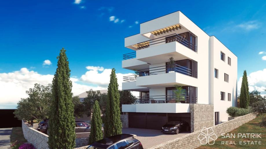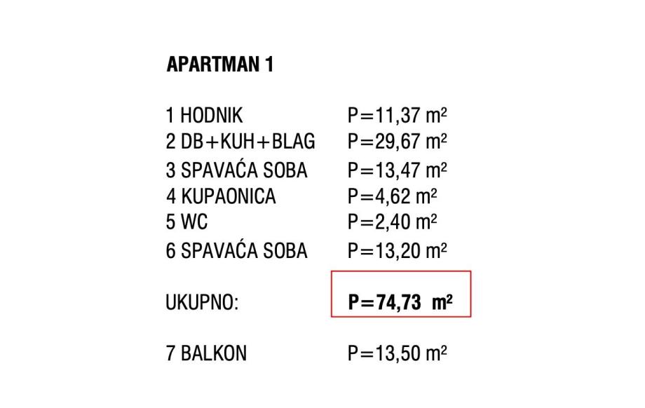 Apartman A1 - 2. kat - stambena površina 74,73 m2 (2 spavaće sobe + kupaonica + WC) + natkrivena terasa (13,50 m2) + ostava (5 m2) + vanjsko parking mjesto, sve neto obračunske površine 87,48 m2 = 600.000 EUR