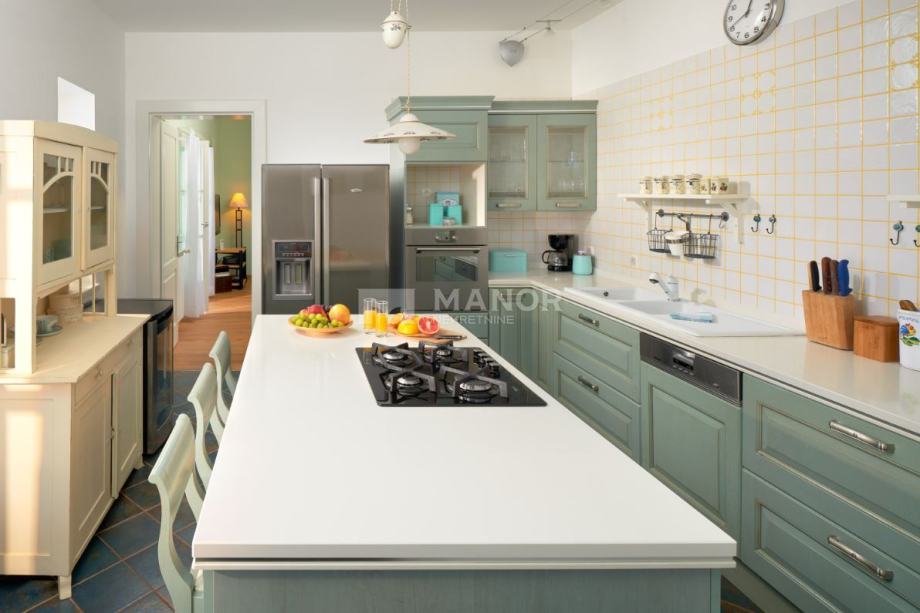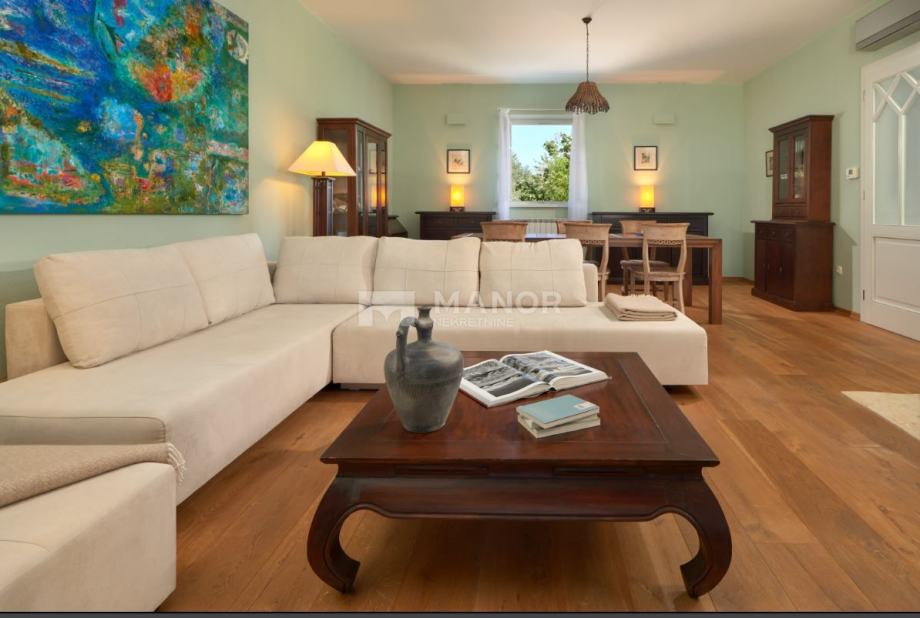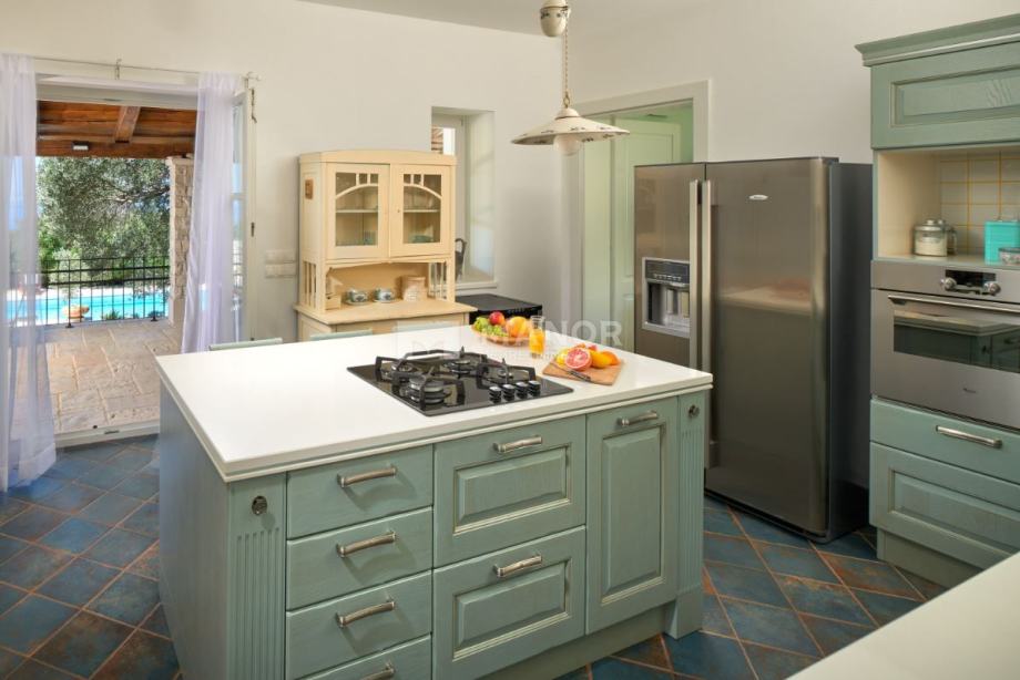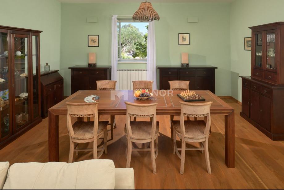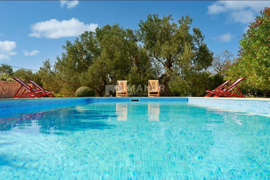 i izlazom na prostranu natkrivenu terasu i okućnicu s bazenom i sunčalištem, kuhinja, izba, kupaonica kao i prostorija za pranje i glačanje.