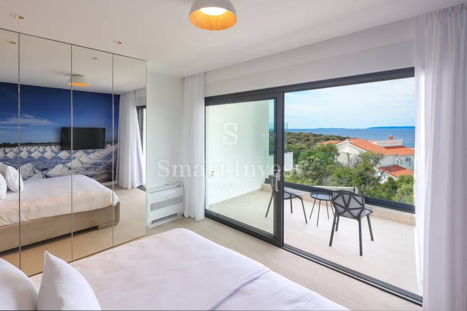 Na katu nalaze se dvije komforne spavaće sobe, svaka s vlastitom kupaonicom, te obje sobe imaju izlaz na veliki zajednički balkon. S balkona pruža se nezaboravan pogled na plavetnilo Jadranskog mora.