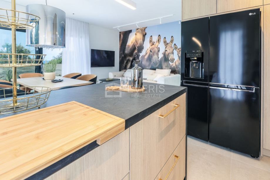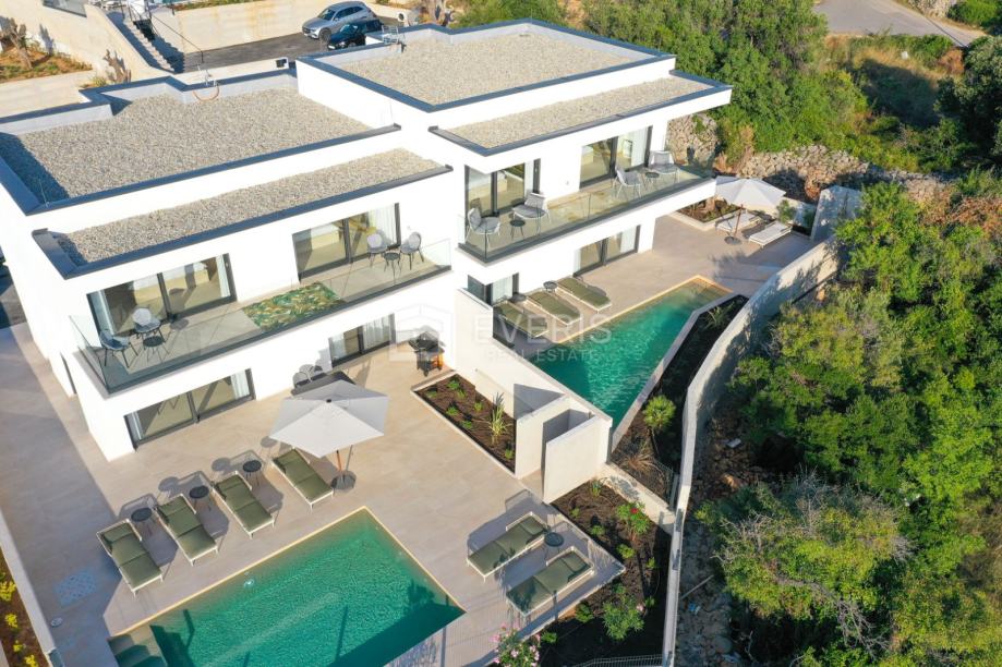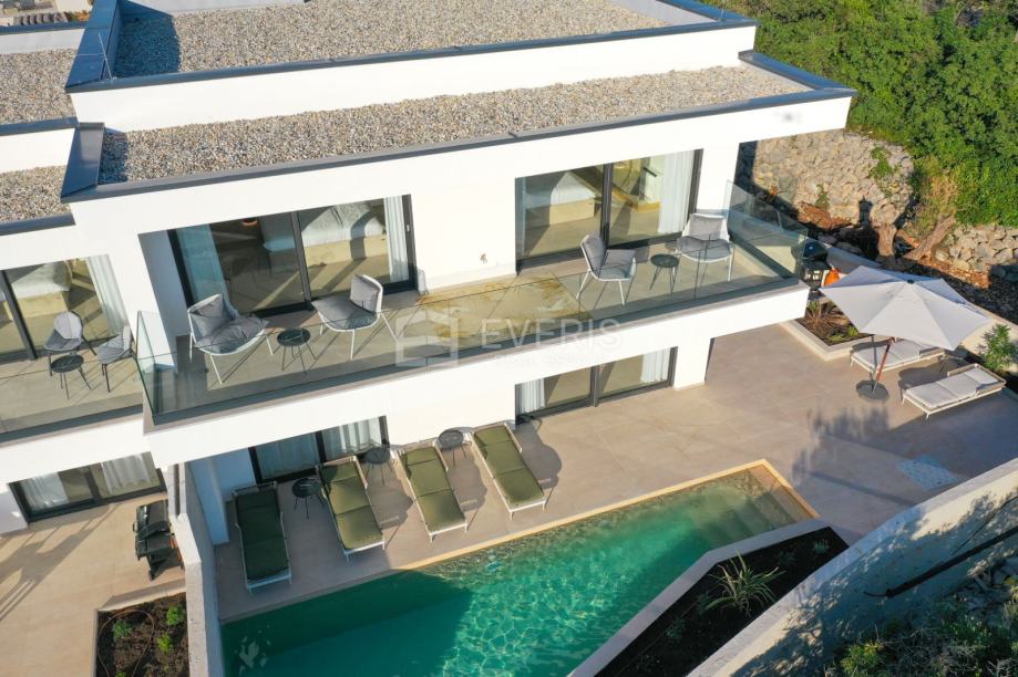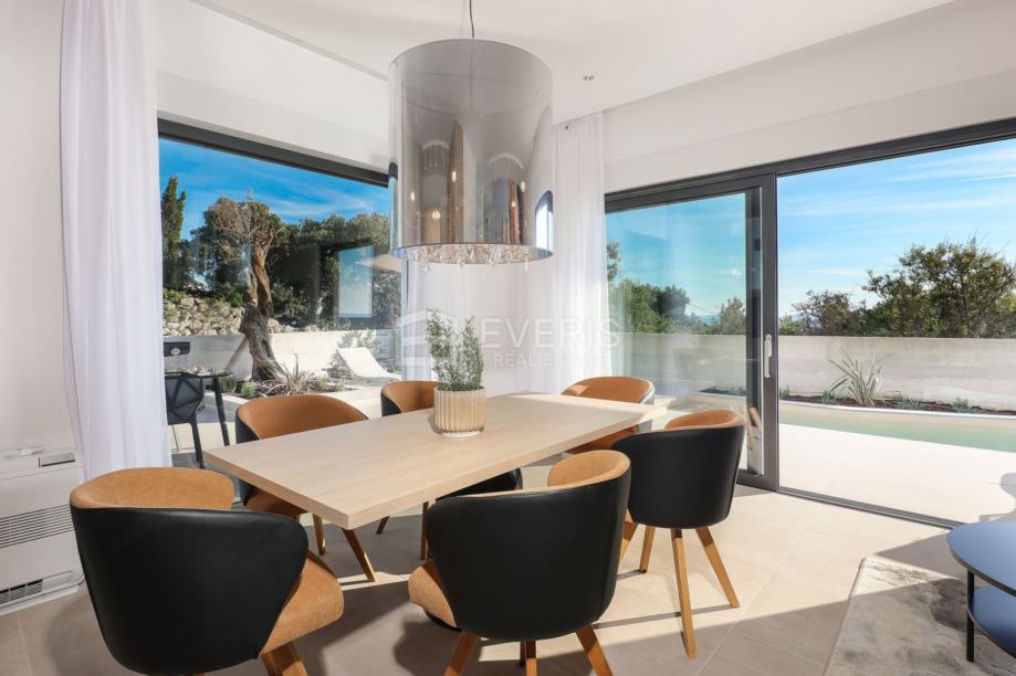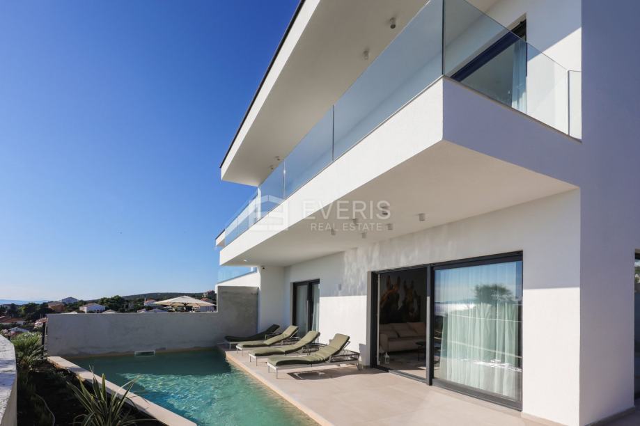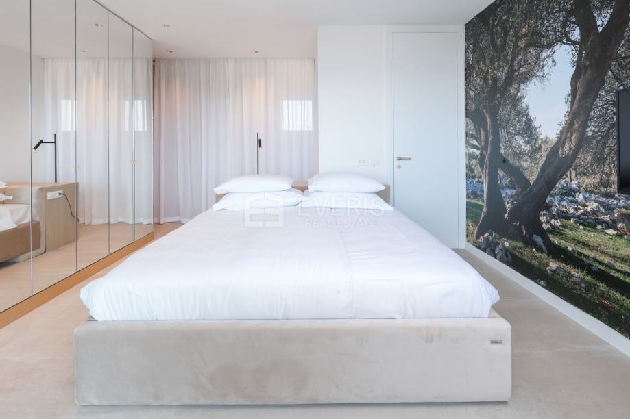 Nekretnina je kvalitetno građena i opremljena: fasada bijela sa Shucco alu stolarijom, troslojno staklo, profili 7,5 cm, sedam klima uređaja, sva oprema bazenska je prvoklasna s toplinskom pumpom i strojarnicom koja će biti veća i sa mogućnošću dodatnog prostora za skladištiti zimi stvari kao npr. ležaljke, stolice, suncobrane.