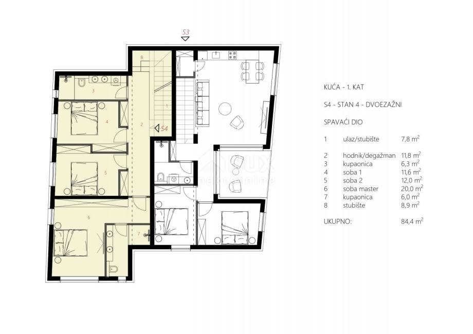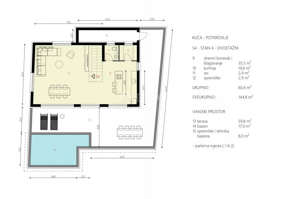 Prodajemo ovaj izuzetan 3s+db penthouse S-4 u modernoj i kvalitetnoj stambenoj zgradi od samo četiri stana. Penthouse je odlično osmišljen kao dvoetažni gdje na donjoj etaži nalazimo ulazni hodnik, kupaonu, tri spavaće sobe od kojih master soba ima vlastitu kupaonu. Unutarnjim stepeništem u visokom potkrovlju imamo open space dnevni dio s kuhinjom i blagovaonicom, gostinjski toalet i spremište. S dnevnog djela izlazimo na prostranu terasu na kojoj imamo bazen, sunčalište i predviđeni prostor za roštiljanje i ugodna ljetna druženja.