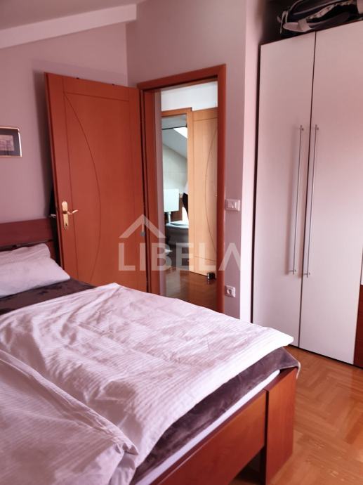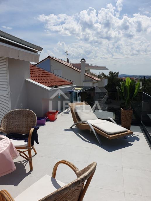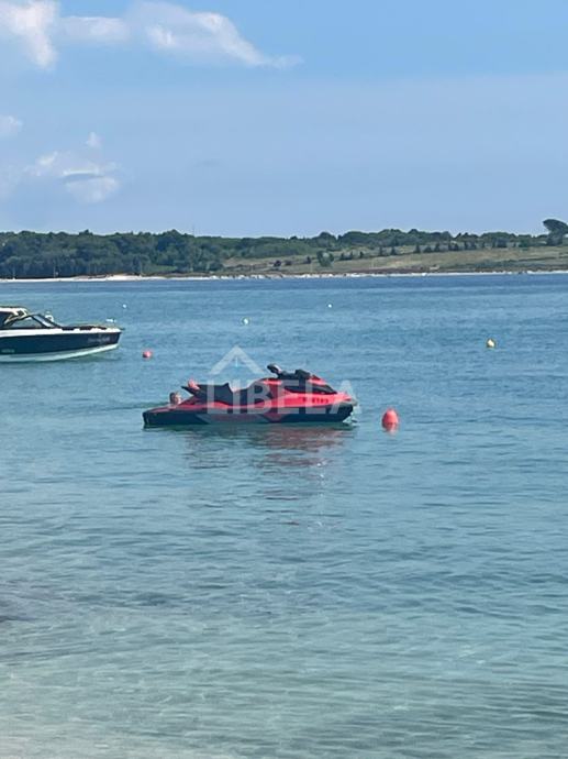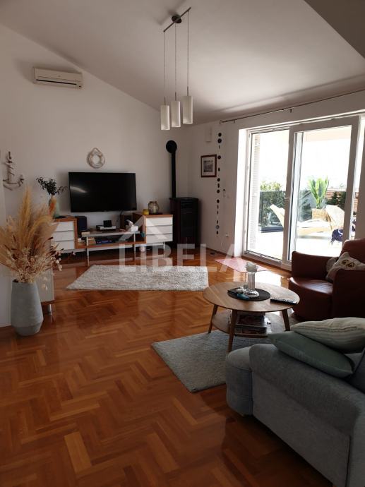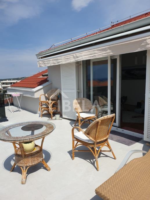 Apartman se nalazi u mirnom dijelu naselja, u potkrovlju objekta (3. kat) u kojem se nalazi devet apartmana, te je to jedini apartman na trećoj etaži. Apartman ima veliku nenatkrivenu terasu od 35 m2 sa pogledom na more, ulazni hall, dvije spavaće sobe, kupaonica, wc, kuhinja, blagovaonica i dnevni boravak te mu pripada parkirališno mjesto od 18 m2. Klimatiziran je i vrhunski uređen, te sav namještaj i uređaji ostaju u apartmanu i ulaze u cijenu. U cijenu također ulazi i jet-ski te dvije bove, jedna za jet-ski u prvom redu, te druga za čamac u drugom redu. Stanu također pripadaju i dvije ostave od kojih je svaka 10 m2 bruto površine, što zapravo zajedno sa terasom daje veću površinu apartmana (80 m2 stambene + 20 m2 bruto ostava + 35m2 terasa).