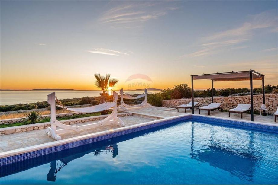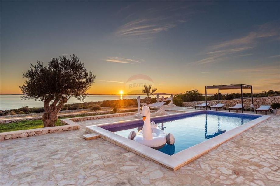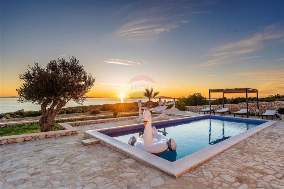 Prodaje se kamena kuća s bazenom u Novalji, predio Škuncini stani. Kuća veličine 180m2 sagrađena je na uređenoj parceli od 1200m2 s prekrasnim pogledom na more. Kuća je u cijelosti je obložena i popločena bračkim i benkovačkim kamenom. Sagrađena je na dvije etaže, PRIZEMLJE i kat.