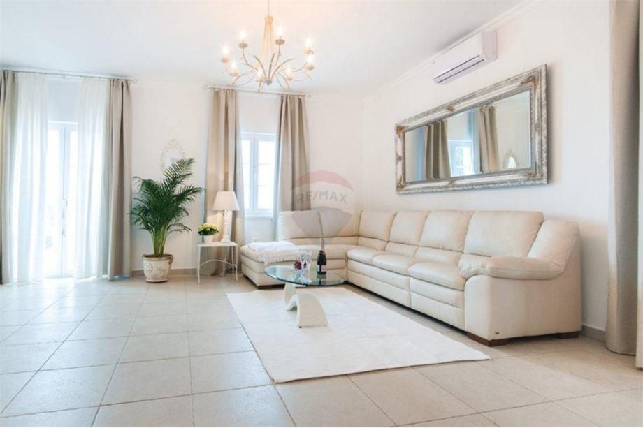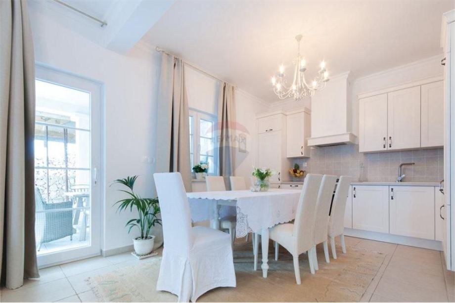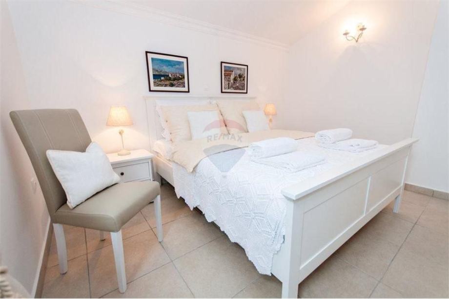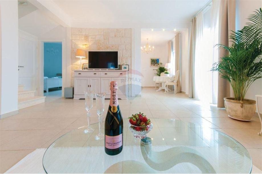 U prizemlju se nalazi kuhinja s blagovaonicom i dnevnim boravkom, kupaonica, jedna spavaća soba s kupaonicom. Unutarnje stepenice vode do kata gdje se nalaze ČETIRI spavaće sobe koje imaju svaka svoju kupaonicu. Iz prizemlja kuće izlazi se na natkrivenu terasu opremljenu prostorom za blagovanje i roštiljem. U dvorištu ispred kuće nalazi sunčalište i bazen s kojeg se proteže panoramski pogled na more i okolicu.