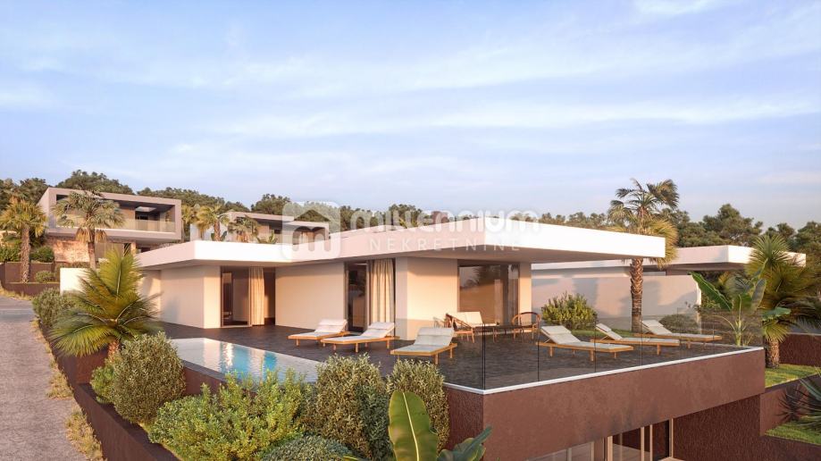 Na prizemlju veličine 143.50m2 nalaze se tri spavaće sobe s vlastitim kupaonicama te prostrana terasa. Stepenište vodi na 1. kat od 245m2 koji je veliki open space prostor koji povezuje dnevni boravak, kuhinju i blagovaonicu iz kojih se izlazi na terasu s bazenom.