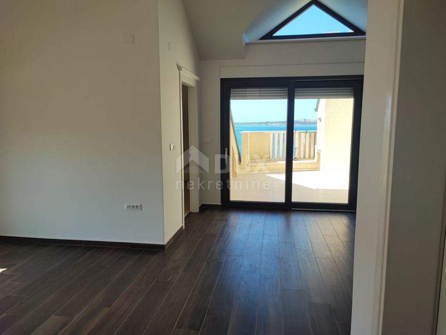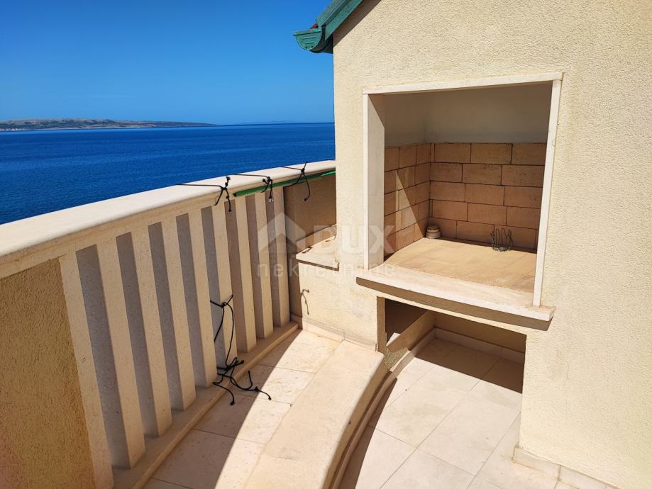 Prodaje se ovaj odličan 3s+db stan H na drugom katu-visoko potkrovlje u visokokvalitetnoj novogradnji na fenomenalnoj lokaciji u prvom redu do mora. Stan je koncepiran kao trosobni te se sastoji od ulaznog hodnika, kuhinje s blagovaonicom i dnevnim djelom s izlazom na terasu, tri spavaće sobe i dva kupatila, sveukupne površine od 113m2. S terase se pruža predivan pogled na more i akvatorij, također na terasi nalazimo uzidani roštilj, pripada mu jedno parkirno mjesto u vlasništvu.