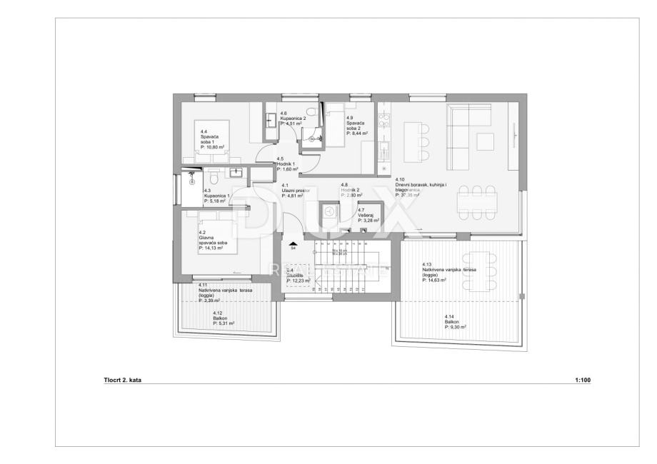 Ukupna obračunska površina, uključujući terasu s koeficijentima, iznosi 118,77 m². U cijenu su uključena dva parkirna mjesta, što dodatno doprinosi udobnosti i praktičnosti stanovanja.