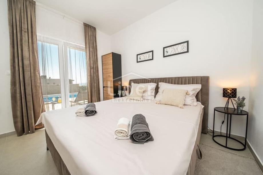 Otok Pag, Lun, prodajemo samostojeću kuću od 180m2 koja se nalazi na okućnici od 465m2 u neposrednoj blizini mora i plaže udaljena svega 80m. Sastoji se od prizemlja u kojem se nalazi dnevni boravak sa kuhinjom, blagovaonom, 2 spremišta, spavaća soba, kupaona dok se na katu nalaze dvije spavaće sobe svaka sa svojom kupaonicom, balkonom. Pogled na more. Na okućnici od 465m2 smjestila se kuća, bazen veličine 8.5x4m (grijani i hlađeni), parking za 3 automobila...Grijanje/hlađenje na 3 klime, grijalice na struju, peć na drva...Izgrađeno 2024.godine. Prodaje se kompletno namještena. Novo u ponudi.