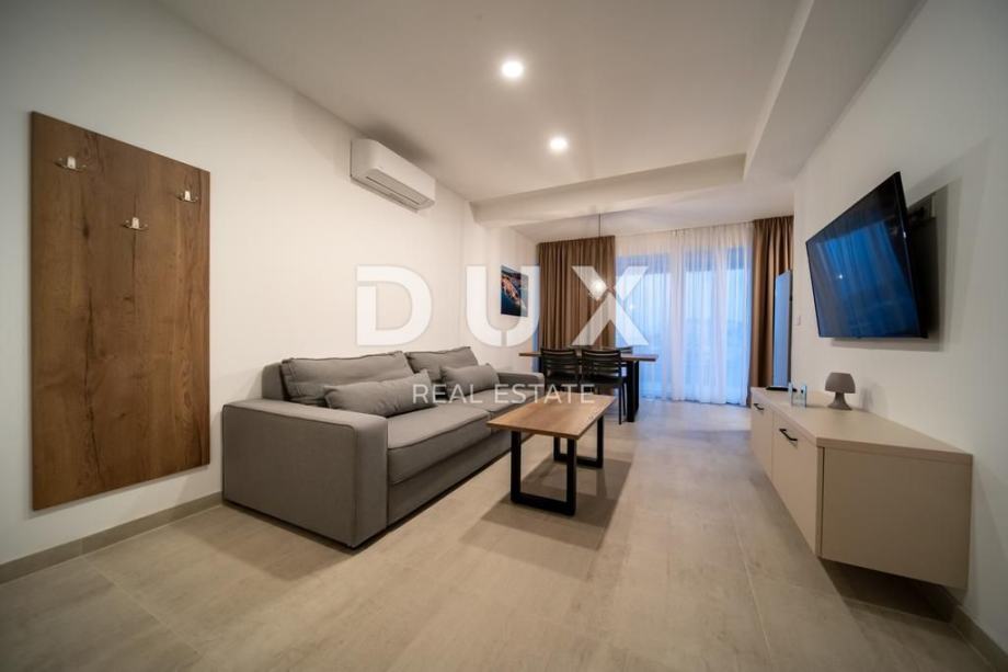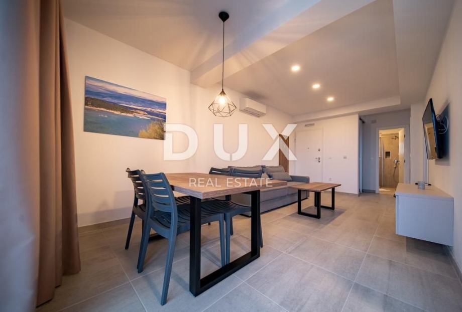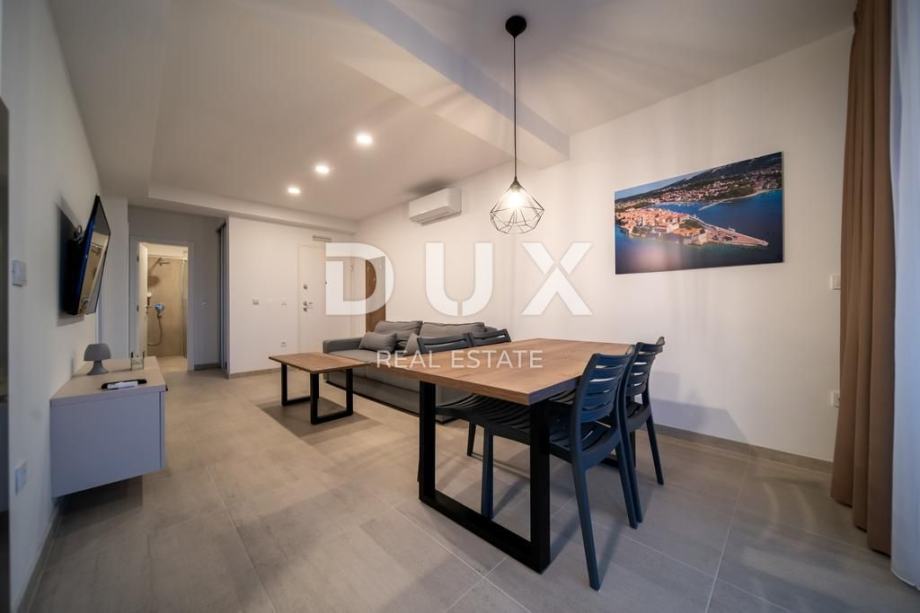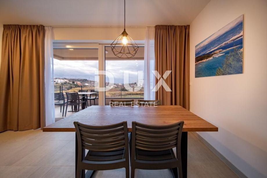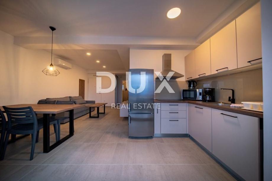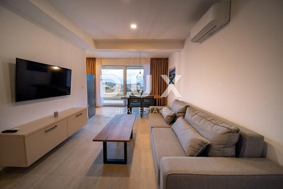 Svaki apartman je luksuzno opremljen (podno grijanje, keramičke pločice, inverter klime, kuhinjski mali aparati, perilice, smart led tv 150 cm, led rasvjeta…), te se sastoji od 2 spavaće sobe, dnevnog boravaka, kuhinje, kupaone/WC i velike terase s pogledom na Lopar.