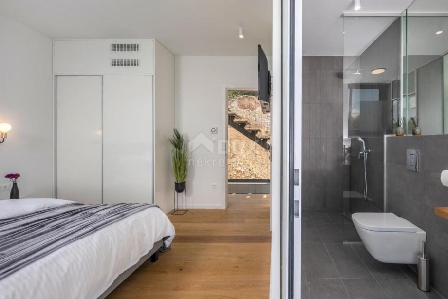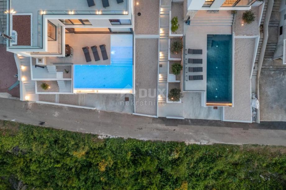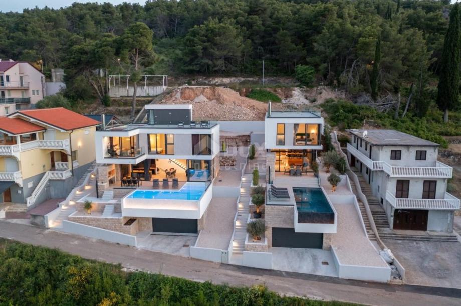 Vile su građene na blagoj padini, pa se kaskadna arhitektonska koncepcija uklapa u okolišni prostor, kao i djelomično kamena fasada u donjem dijelu obje vile koja odražava skladan odnos suvremenog dizajna i prirode. U prizemlju obje vile nalazi se prostrani open space dnevni boravak, blagavaona i moderno opremljena kuhinja, te dodatni WC. Iz dnevnog boravka izlazi se na terasu vile s prekrasnim preljevnim bazenom. Na terasi se nalazi i kameni roštilj. Obje vile su potpuno klimatizirane, opremljene podnim grijanjem, te raspolažu WIFI mrežom, te satelitskom i kabelskom televizijom. Na katu vile nalaze se tri spavaće sobe s pripadajućim kupaonicama. Jedna vila ima i sunčalište na krovnoj terasi, kao i igralište za djecu u dvorištu. Obje vile imaju po dva parkirna mjesta.