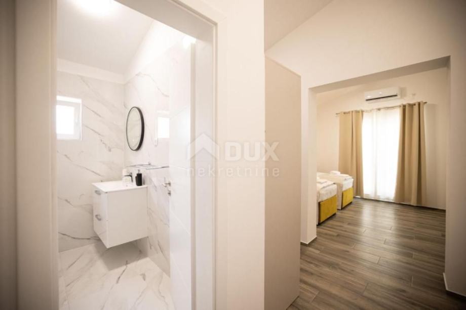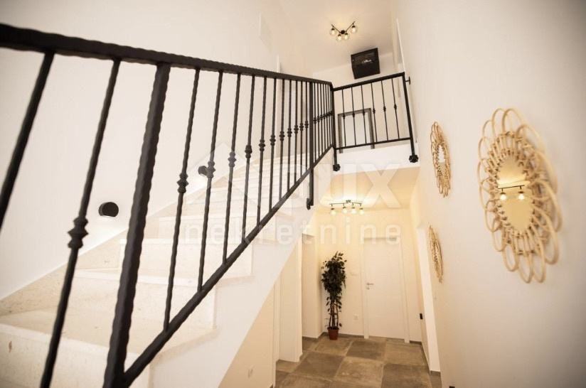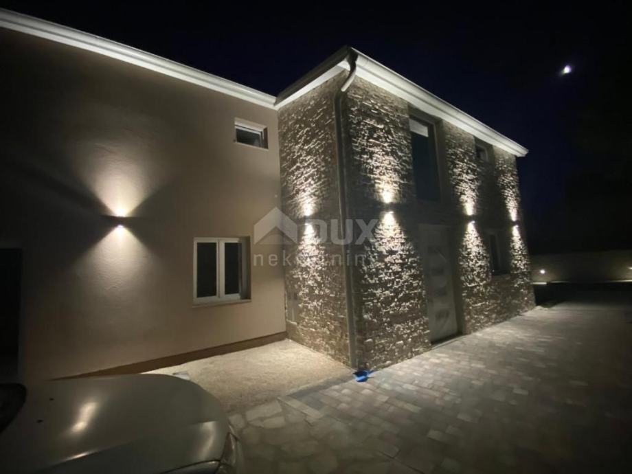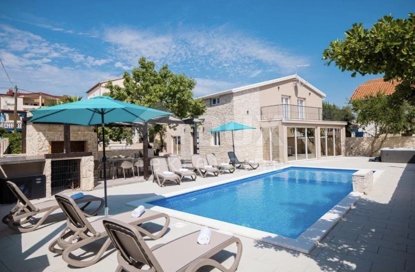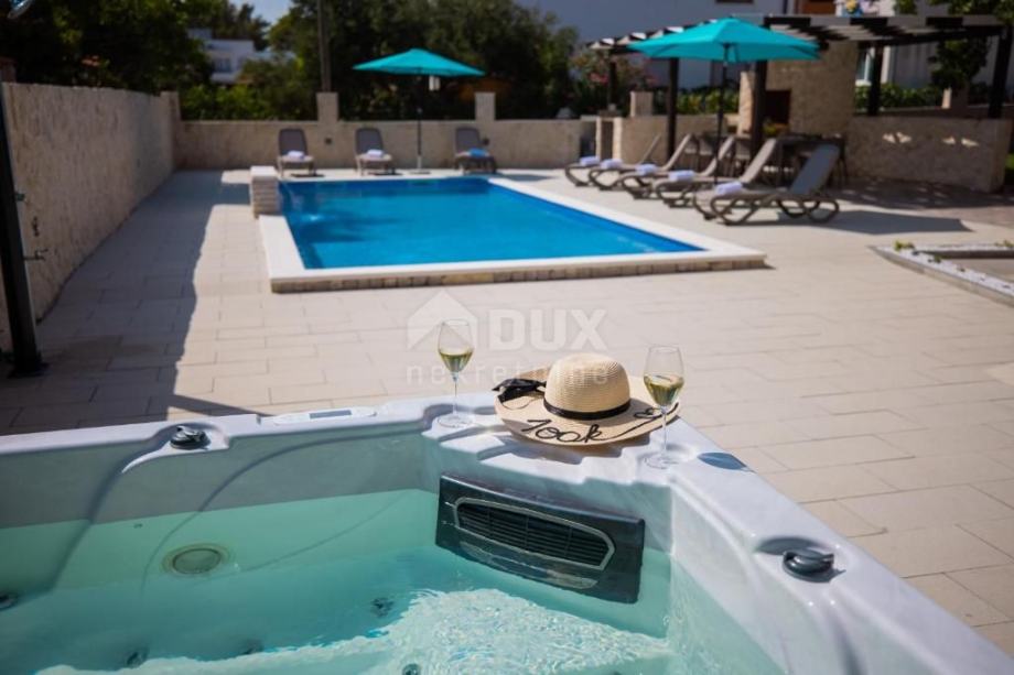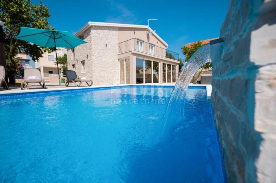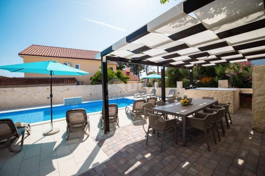 Prodaje se predivna vila na otoku Viru smještena na izvrsnoj lokaciji. Vila je izgrađena 2021.g sa vrhunskim materijalima, pažljivo biranim namještajem, vanjskim bazenom i prekrasno uređenom okućnicom. Vila se sastoji od 5 odlično opremljenih master soba na katu. Ulaz u vilu sa galerijom gdje se smjestio komforan dnevni boravak, kuhinja i blagovaona te zimski vrt. U podrumu se nalazi soba za relaksaciju sa saunom, fitness spravama i igraonicom. Dvorište površine 575m2 je ograđeno u potpunosti ogradom visine 130-180cm. Kombinacija zelene površine s stablima trešnje, višnje, jabuke, badema i šipka te tlakavaca i benkovačkog kamena. Ispred kuće napravljen je grijani vanjski bazen sa ležaljkama i suncobranima, veliki jacuzzi za 5 osoba, roštilj i stol za 10 osoba za druženje. Ova vila predstavlja veliki potencijal za izgradnju vlastitog posla i opuštanja u krajoliku.
