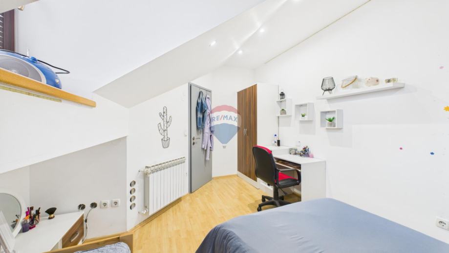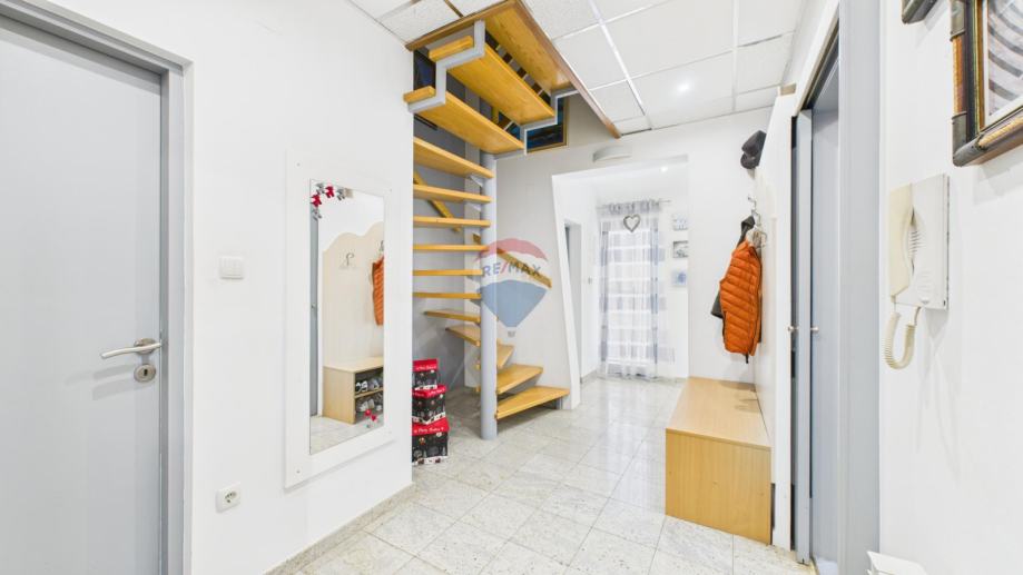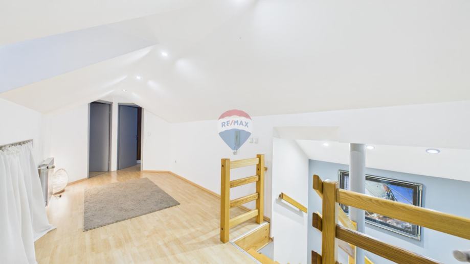 Nalazi se u stambeno poslovnoj zgradi na prvom i drugom katu. Sastoji se od stubišta, hodnika, open space dnevnog boravka sa blagovaonom i izlazom na balkon, prostrane kuhinje sa ostavom, vešeraja i kupaonice na prvoj etaži te dvije spavaće sobe, toaleta i hodnika u potkrovlju. Mogućnost pregradnje treće spavaće sobe. Uređen je i namješten 2005. godine i prodaje se sa svim namještajem. Parkirna mjesta nalaze se u dvorištu.