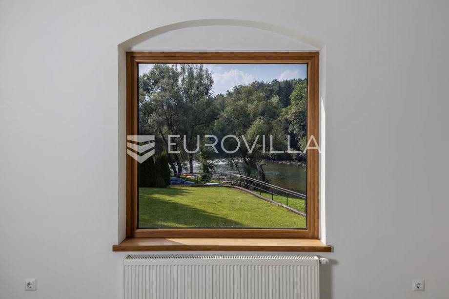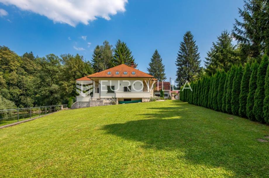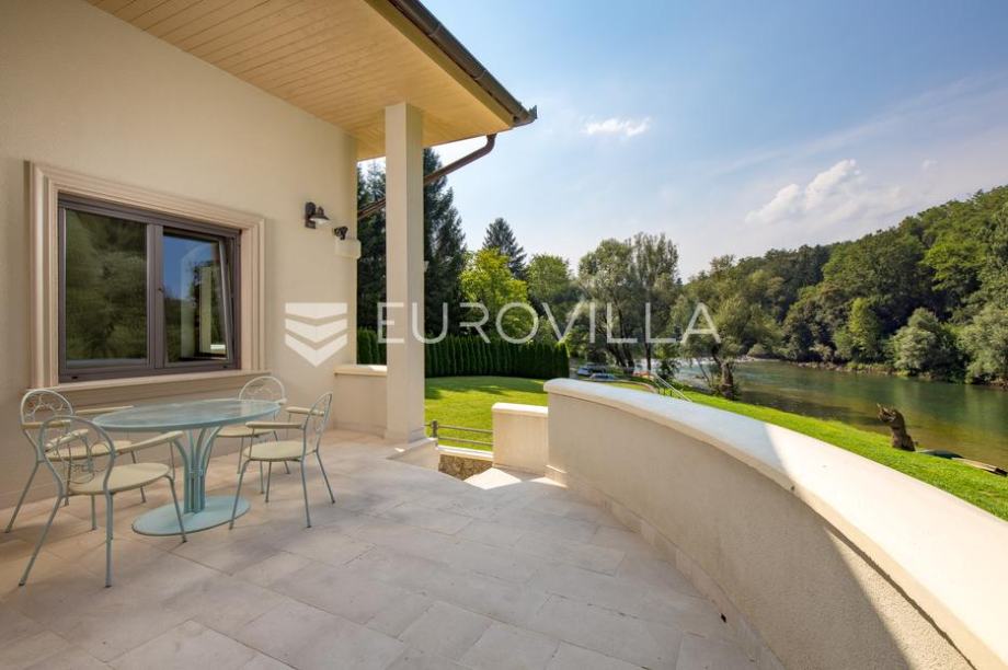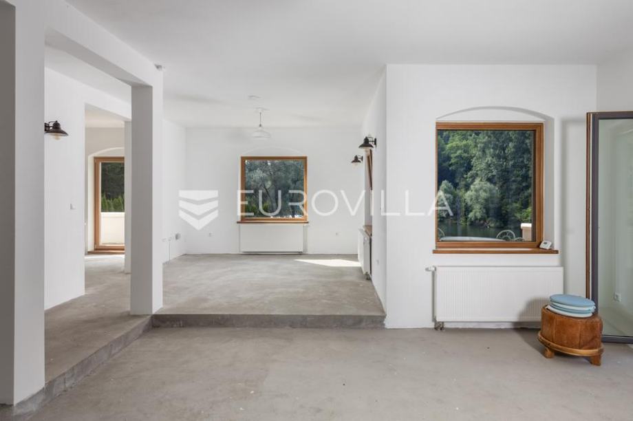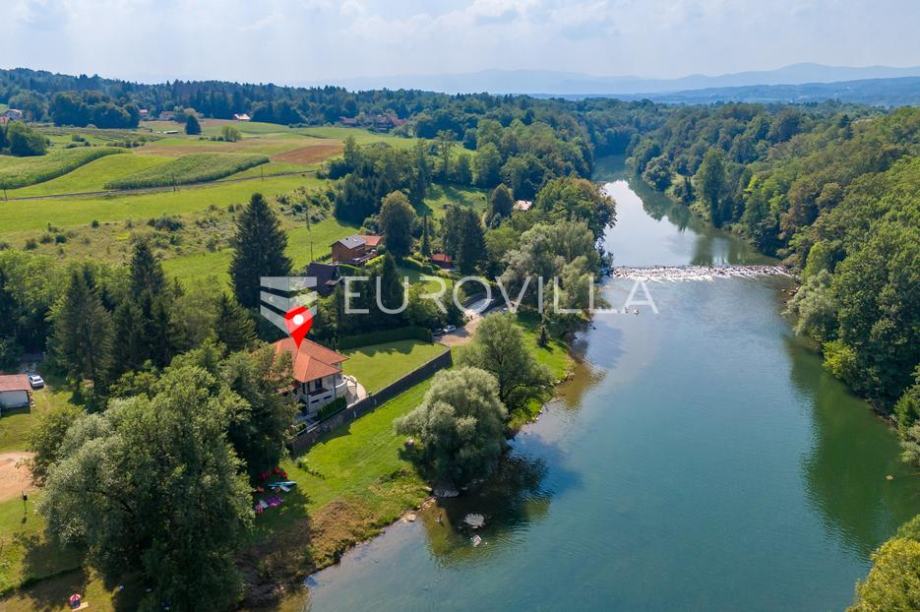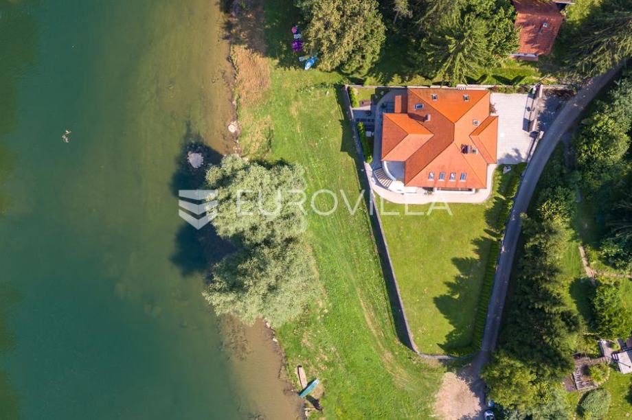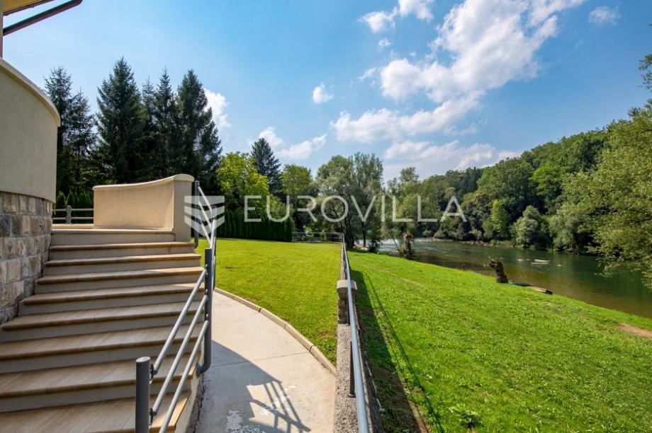 Ozalj, Kamanje, a beautiful newly built family villa next to the Kupa river itself. Area 580m2 located on a plot of 1,600m2. The house is divided into 3 floors.Basement: tavern with open fireplace, wine cellar, apartment, kitchen with dining room, bathroom with toilet, technical part for boiler...