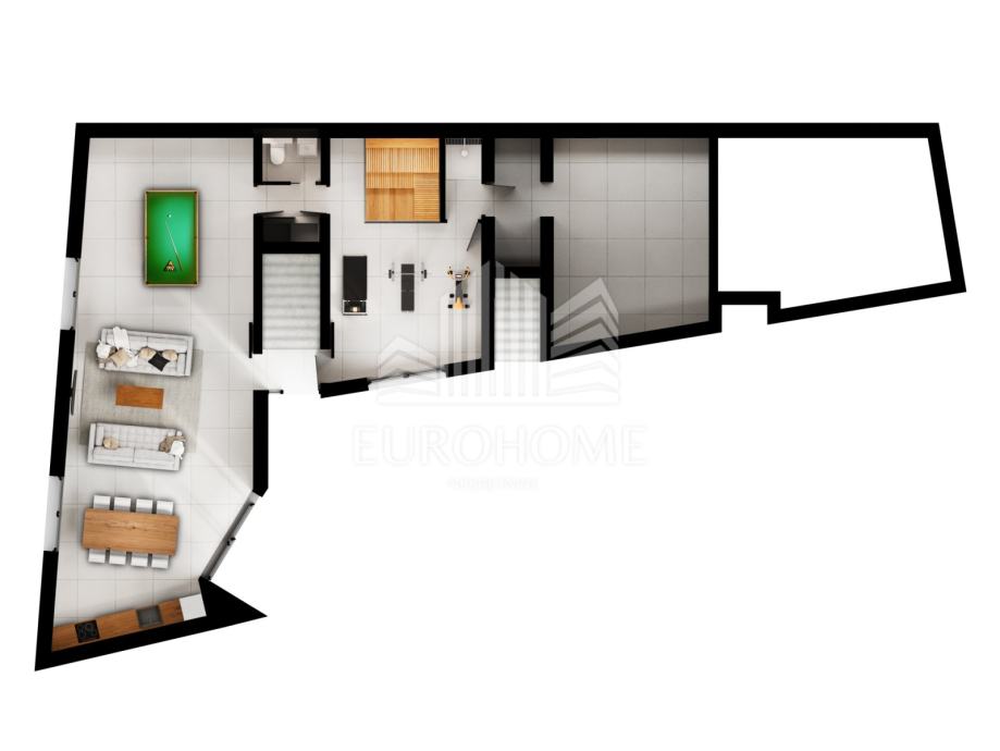 - U prizemlju se nalazi dodatno izolirana lounge room prostorija koja ima biljarski stol i stolni nogomet te luksuzno opremljena teretana sa pripadajućom infracrvenom saunom za 6 osoba