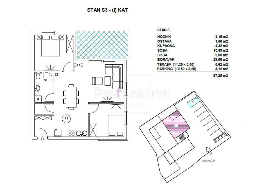 Prodaje se stan, veličine 67,25 m2, smješten na PRVOM katu novogradnje iz 2024. godine, u predivnom gradu Pagu. Ovaj 2,5-sobni stan (2S+DB) idealan je za sve koji traže udoban i moderan dom. Nalazi se u zgradi sa ukupno 9 stambenih jedinica. Zgrada je sagrađena na zemljištu veličine 845m2, u gradnji je posveća posebna pažnja na funkcionalnost zajedničkog vanjskog prostora, osigurano je dovoljno parkirnih mjesta za sve jedinice dok je ostavljeno mjesta i za posjetitelje. U gradnji su korišteni vrhunski materijali, kvalitetna aluminijska troslojna podizno potezna stolarija,električne podizne rolete na otvorima balkona, balkoni/terase dodatno izloirani. Prostorije dnevnog boravka imaju ugrađeni dimnjak što omogućava instalaciju dodatnog grijanja.