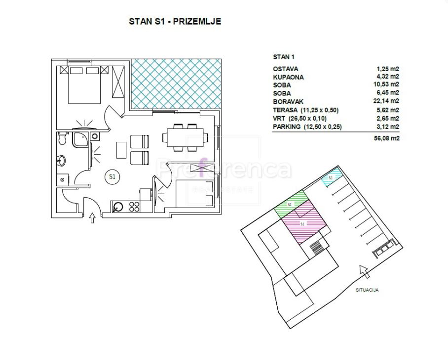 Prodaje se stan, veličine 56,08 m2, smješten u prizemlju novogradnje iz 2024. godine, u predivnom gradu Pagu. Ovaj 2,5-sobni stan (2S+DB) idealan je za sve koji traže udoban i moderan dom. Nalazi se u zgradi sa ukupno 9 stambenih jedinica. Zgrada je sagrađena na zemljištu veličine 845m2, u gradnji je posveća posebna pažnja na funkcionalnost zajedničkog vanjskog prostora, osigurano je dovoljno parkirnih mjesta za sve jedinice dok je ostavljeno mjesta i za posjetitelje. U gradnji su korišteni vrhunski materijali, kvalitetna aluminijska troslojna podizno potezna stolarija,električne podizne rolete na otvorima balkona, balkoni/terase dodatno izloirani. Prostorije dnevnog boravka imaju ugrađeni dimnjak što omogućava instalaciju dodatnog grijanja.