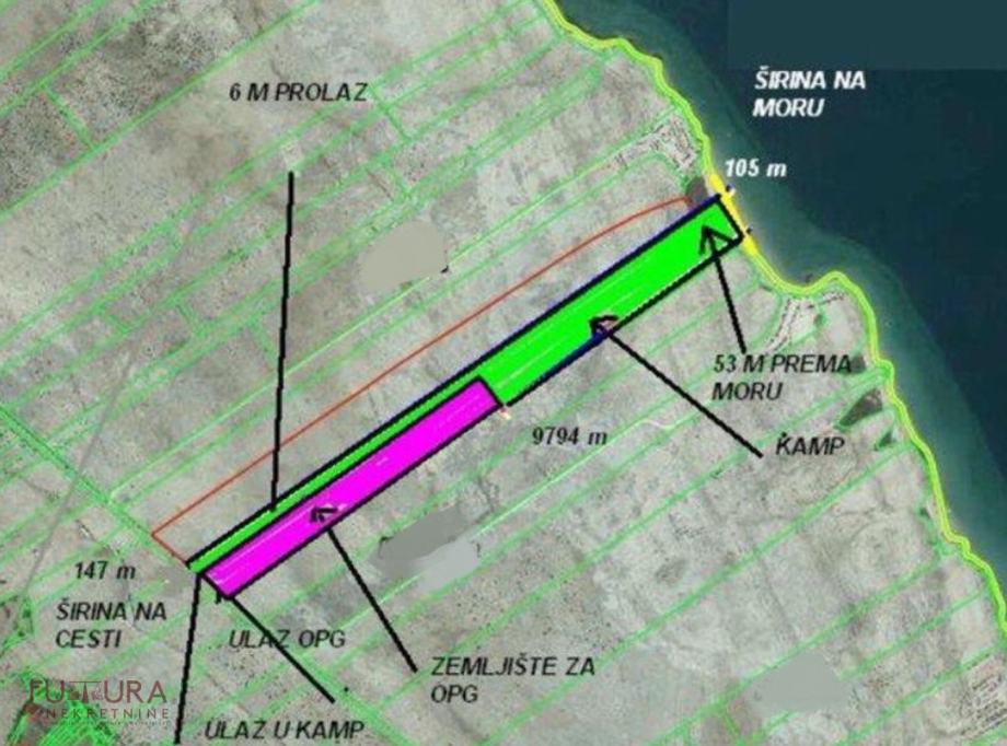 Zemljište se nalazi djelom u građevinskoj turističkoj zoni T3 cca. 7000 m2 ostalo je poljoprivredno, pravilnog je oblika asfaltni prilaz.