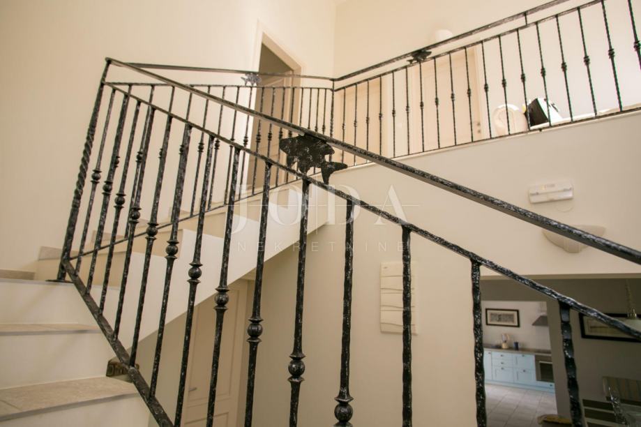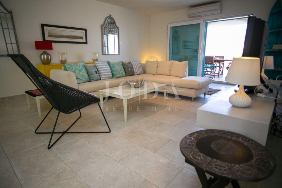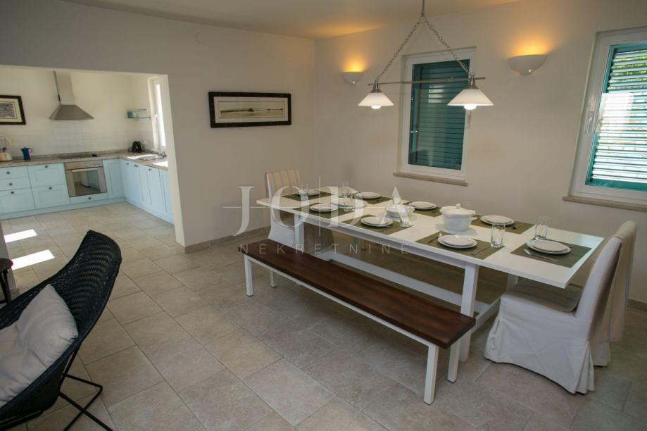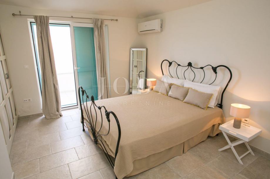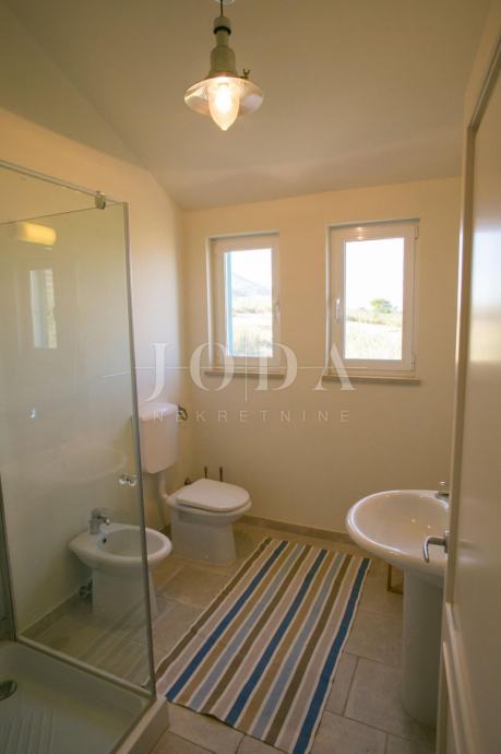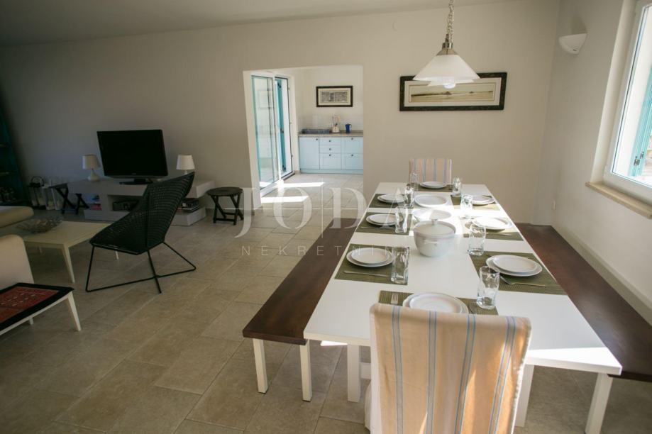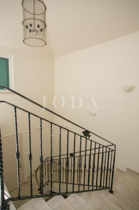 U prizemlju kuće je smješten zaseban apartman dvosobni sa dnevnim boravkom dok je na gornjim etažama dvoetažni stan koji u donjem dijelu ima dnevni prostor sa velikom terasom a na gornjoj etaži tri spavaće sobe svaka sa vlastitom kupaonicom. Velika ograđena okućnica na samoj obali čine ovu nekretninu posebnom .
