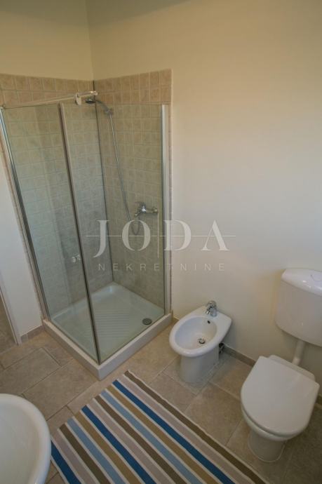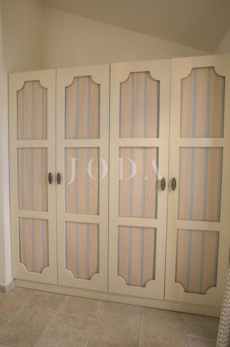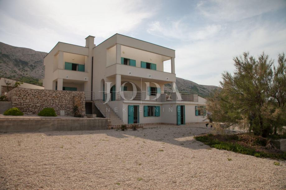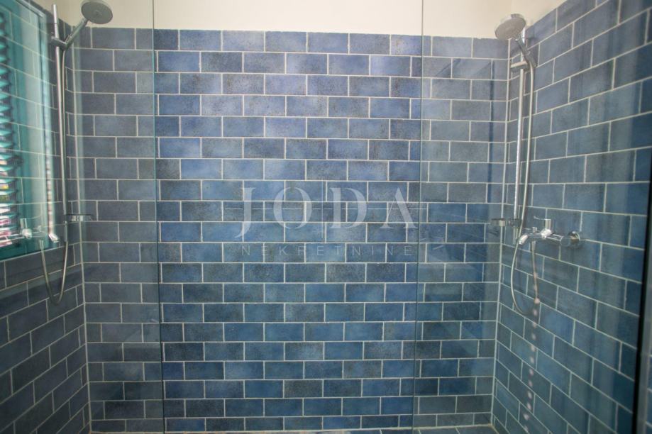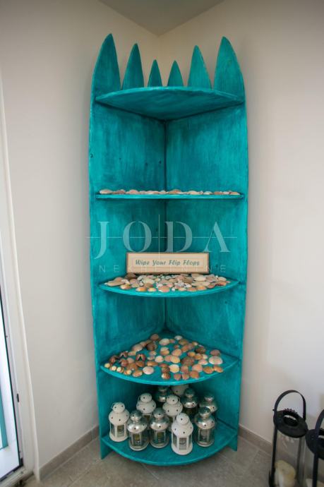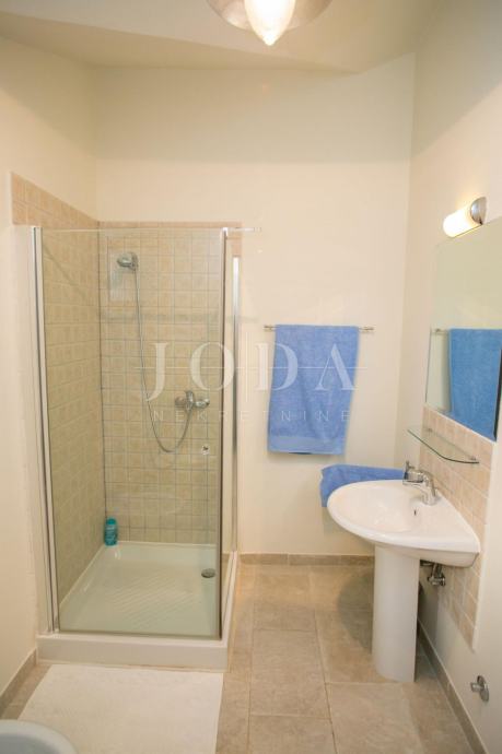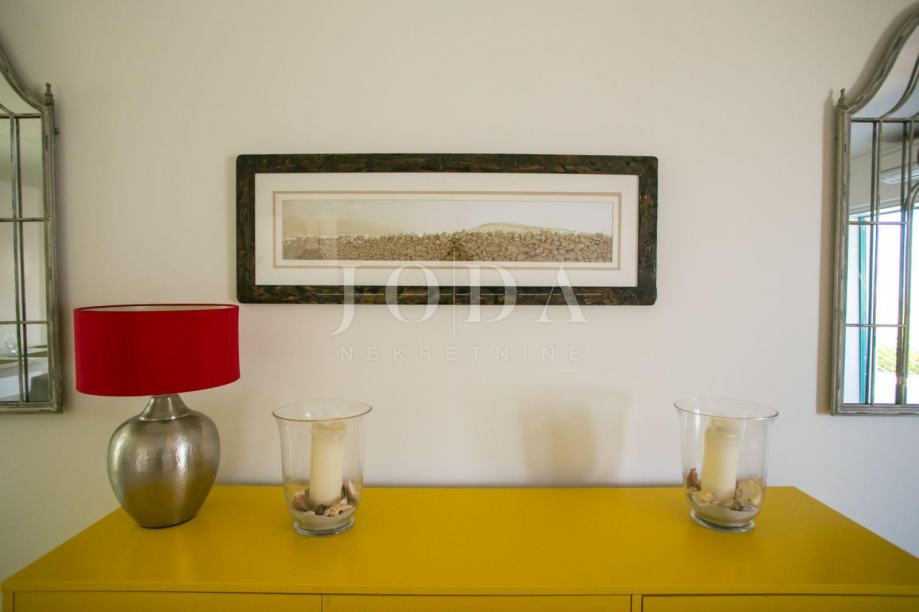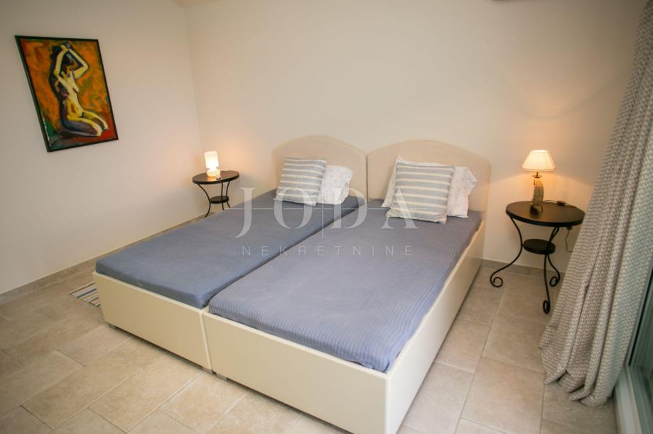U prizemlju kuće je smješten zaseban apartman dvosobni sa dnevnim boravkom dok je na gornjim etažama dvoetažni stan koji u donjem dijelu ima dnevni prostor sa velikom terasom a na gornjoj etaži tri spavaće sobe svaka sa vlastitom kupaonicom. Velika ograđena okućnica na samoj obali čine ovu nekretninu posebnom .