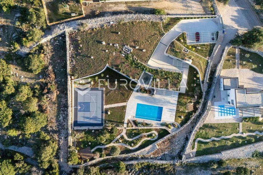 Nalazi se na parceli površine 4.025 m², s koje se pruža neometan panoramski pogled na more u čak tri strane svijeta.
