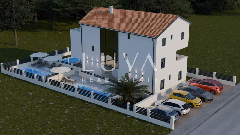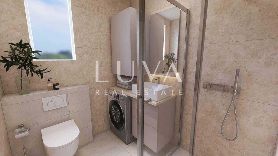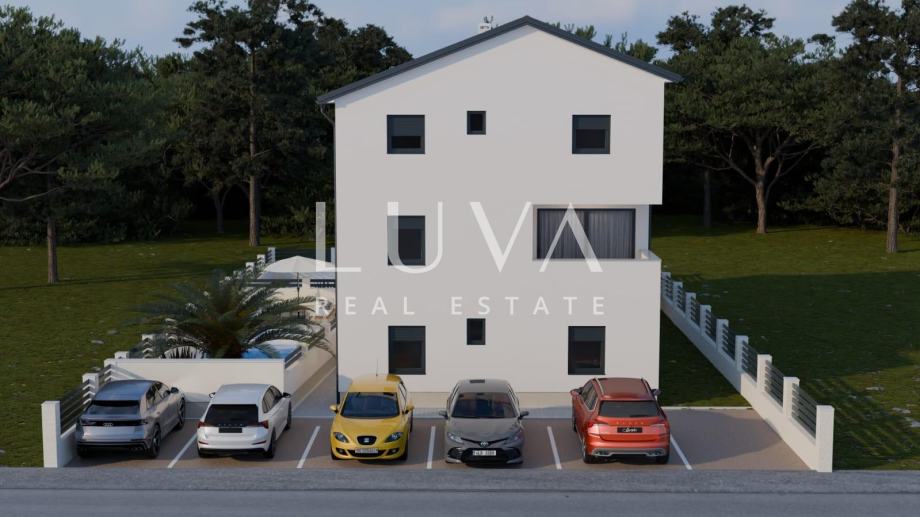 Nalazi se na prvom katu manje zgrade s ukupno tri stambene jedinice, a pripada mu i vrt (60m2) s mogućnošću ugrađivanja bazena(instalacije su provedene), te dva parkirna mjesta.