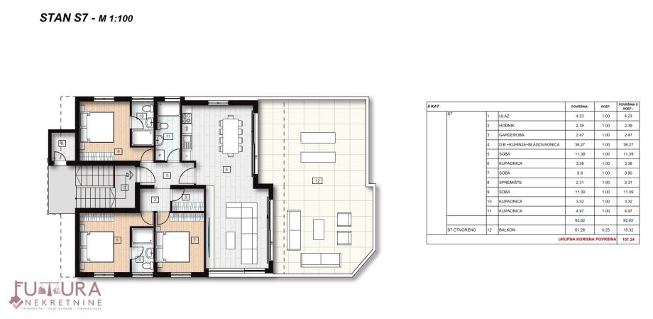 Sastoji se od: tri spavaće sobe, dnevnog boravka + kuhinja + blagovaona, hodnika, tri kupaonice, garderobe, spremišta i terase.