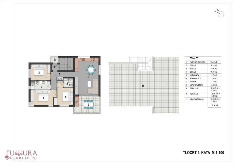 Sastoji se od: tri spavaće sobe, dnevni boravak + kuhinja + blagovaona, dvije kupaonice i dvije terase.
